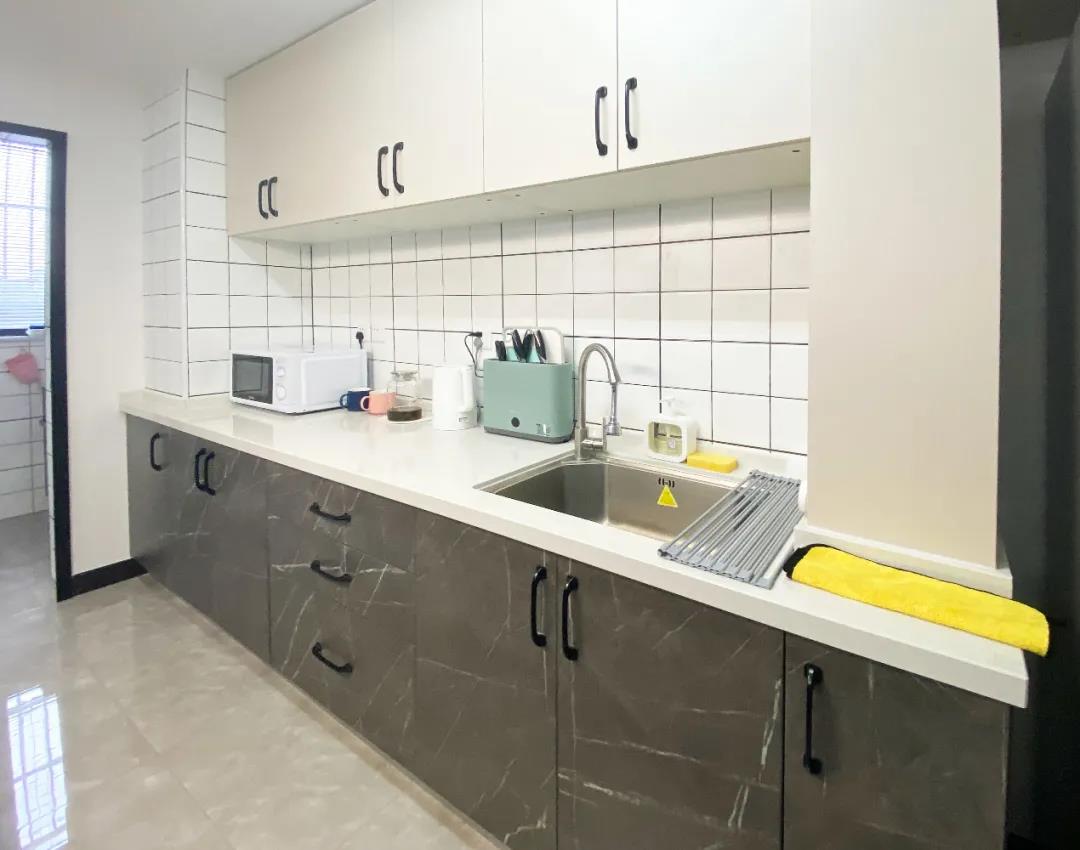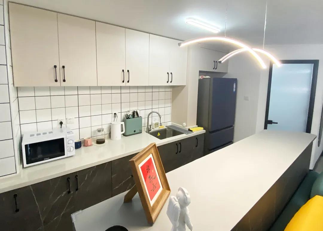 拆掉原来厨房与客厅共用的墙体,将传统封闭式厨房改为开放式厨房,在这里打造了储物式吧台,为厨房增加不少储物空间。一组一字型橱柜,作为西餐区。