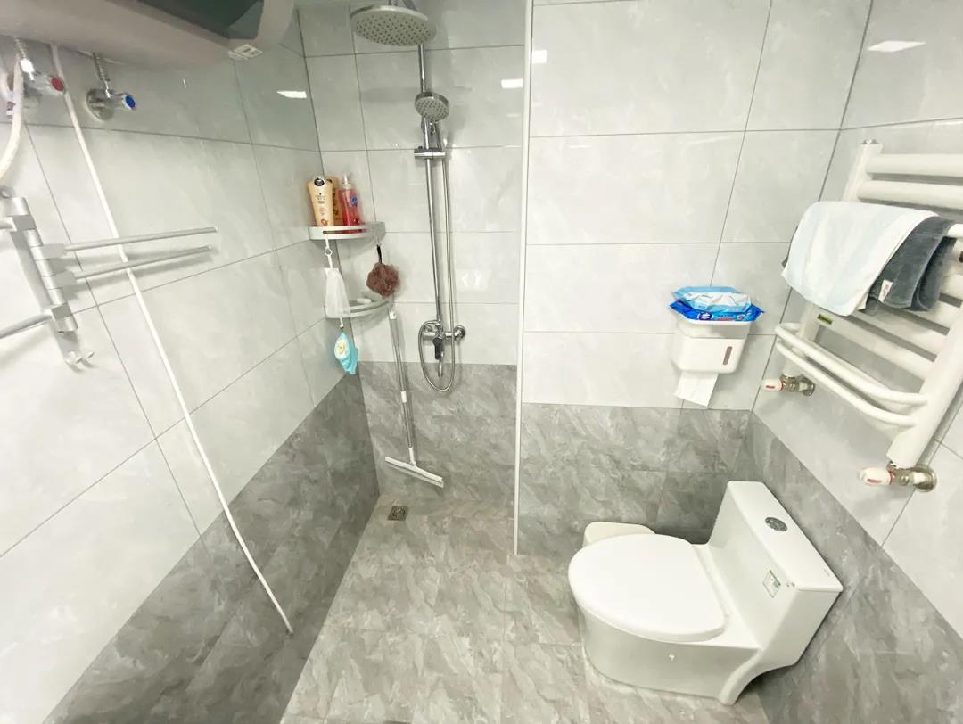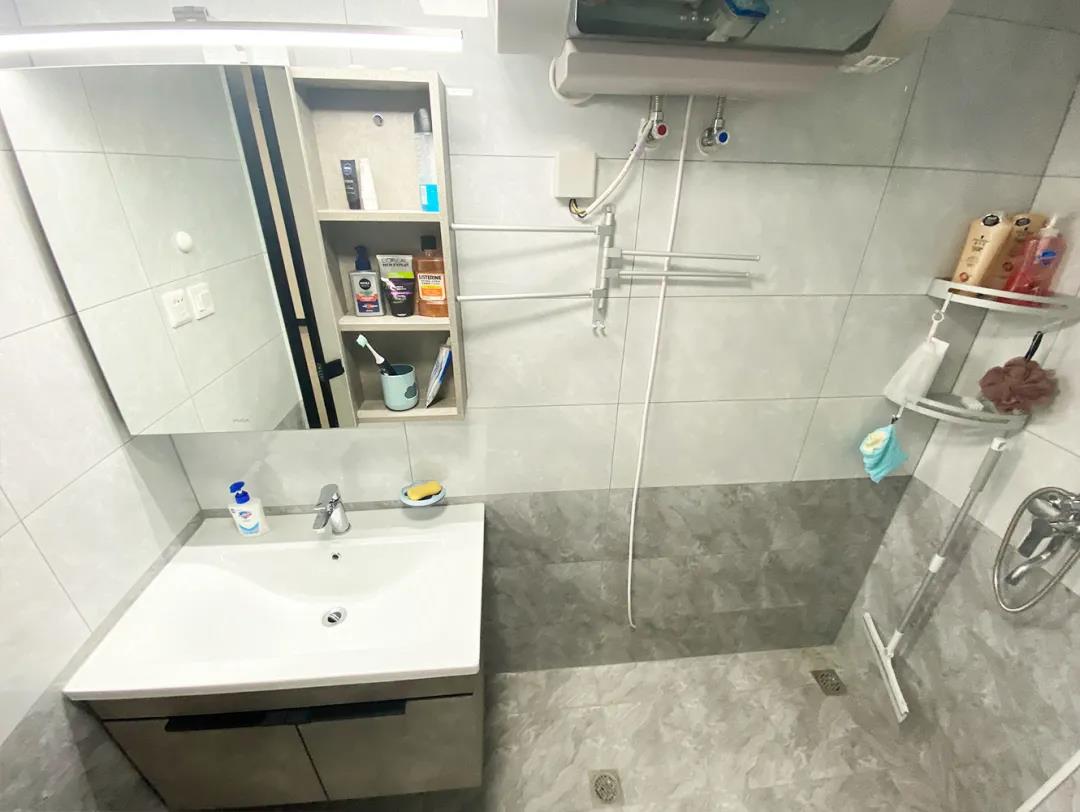卫生间现在是干湿分离,洗手池在外面,如厕、淋浴、洗衣机都在这4平米的湿区,每次洗澡水溅的到处都是,李先生夫妇希望改造后的卫生间能够将洗衣机外移,且淋浴要留出足够大的空间。