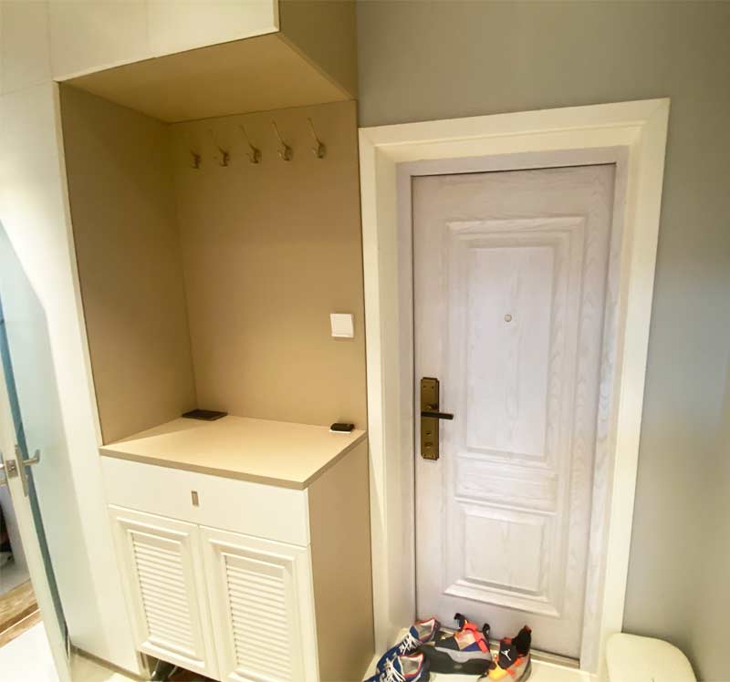 设计师挪走了门厅原有的洗衣机,利用定制家具,打造了一组通顶鞋帽柜,顶面利用点光源照明,解决了采光差的问题,整体空间干净整洁,美观实用。