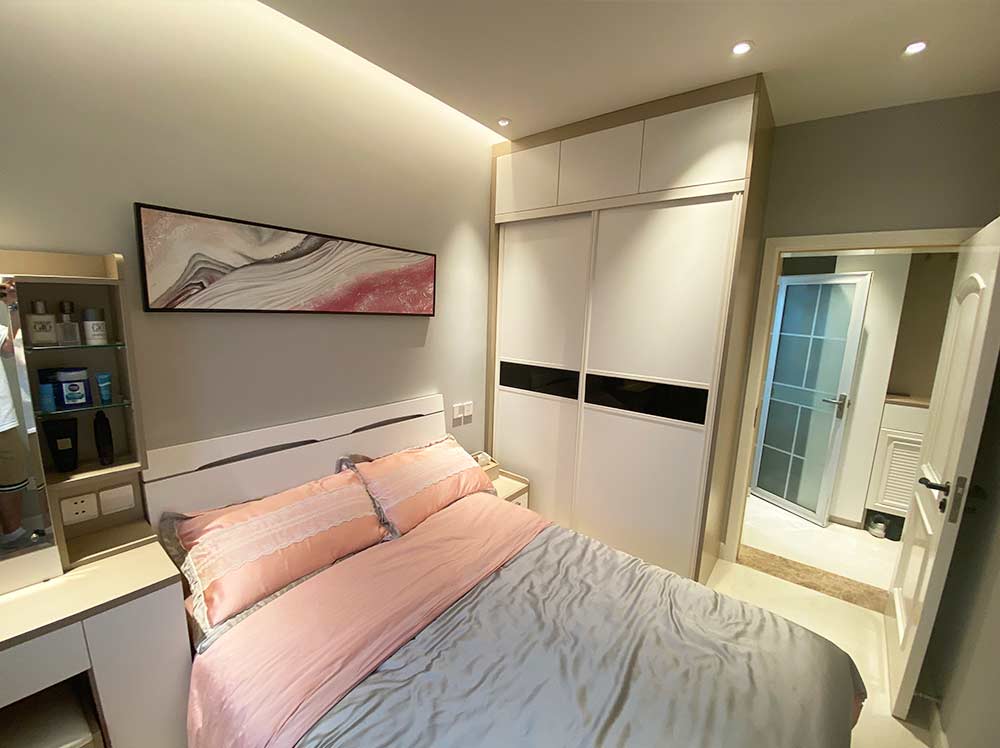 卧室内量身定制的衣柜和梳妆台满足了日常储物和生活需求,筒灯和洗墙灯的搭配为卧室营造了温馨的氛围。