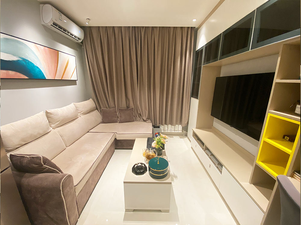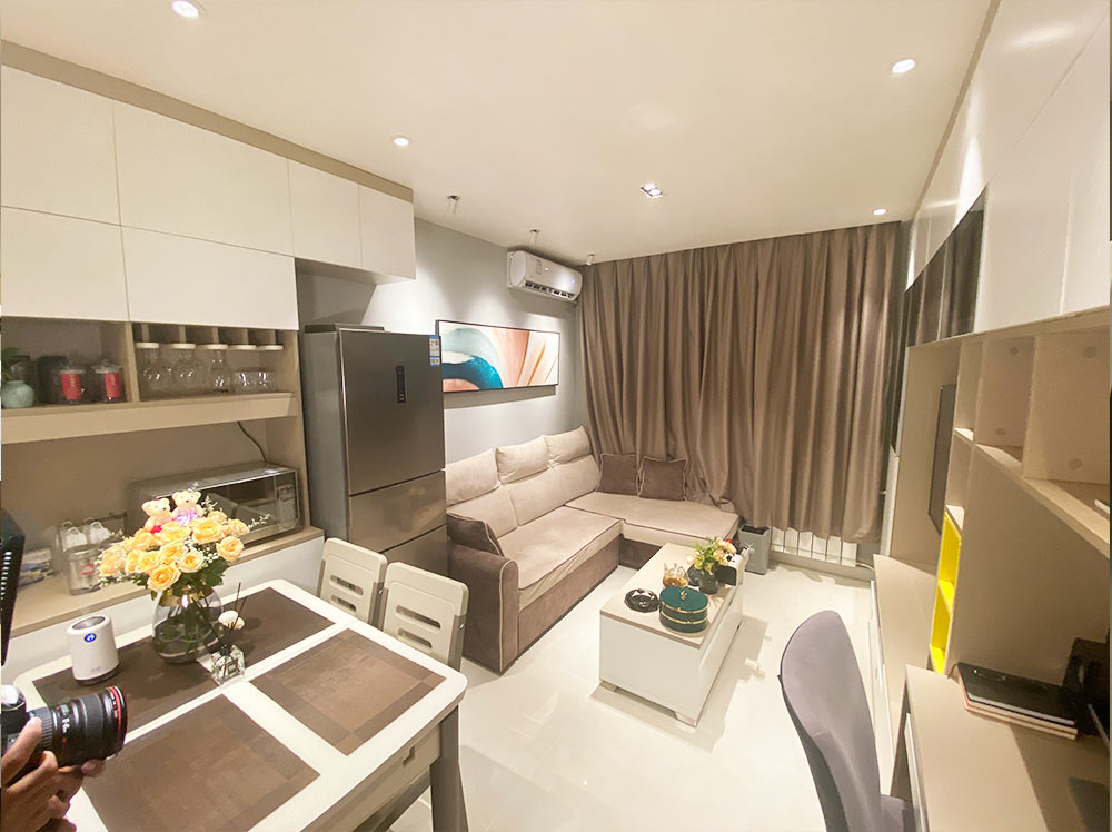 设计师将主卧规划为客厅,选用沙发床,方便未来老人照看孩子临时居住,茶几则选择了可升降茶几,满足未来小两口边用餐边看电视的需求。