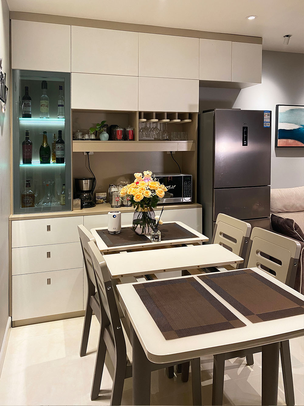 设计师将1.7平米的开放式阳台进行封闭,纳入到厨房,现在厨房面积将近6平米,一组一字形橱柜,动线合理,储物充足,操作空间大大提升。并且将原有门厅的洗衣机也嵌入到橱柜中,改造后的厨房美观实用。