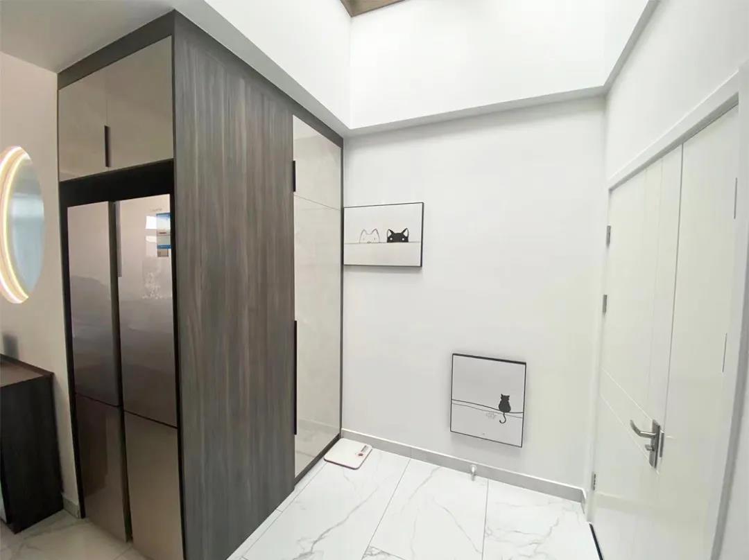 往里走,进入到半污染区的玄关,一组通顶储物柜,分担了家里的收纳需求,另一边还兼顾了电器柜的功能,将原有厨房的双开门冰箱外挪,嵌入到里面,实用又好用。