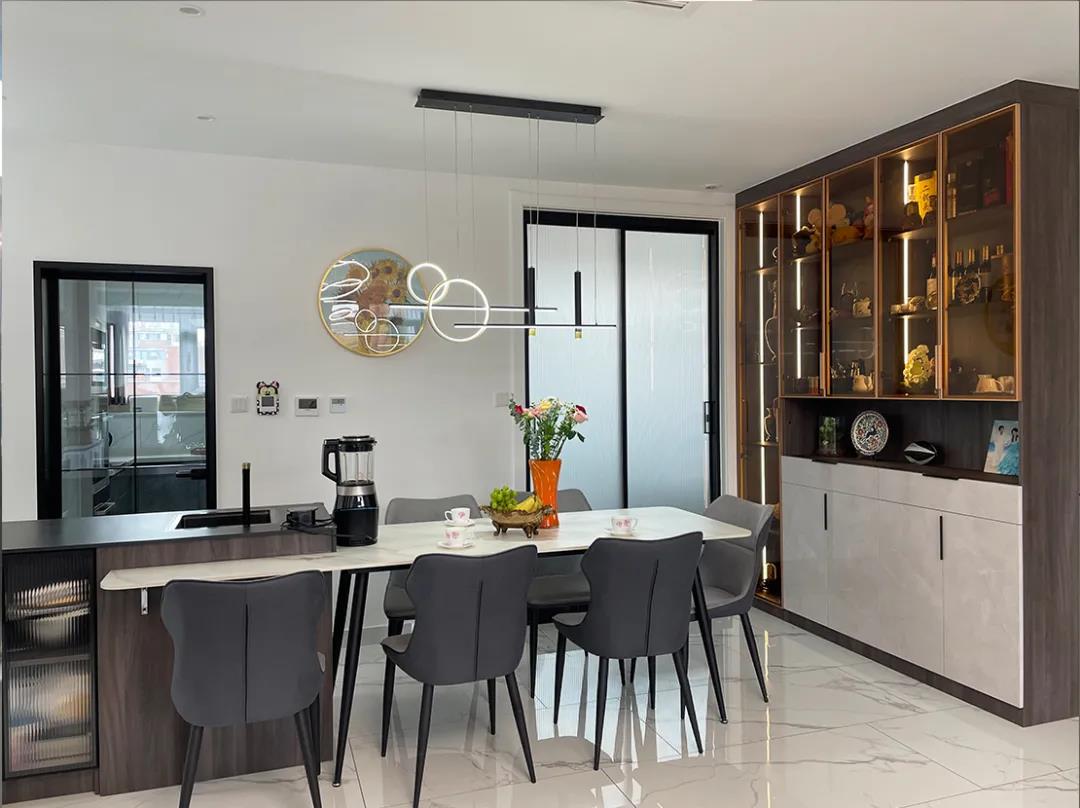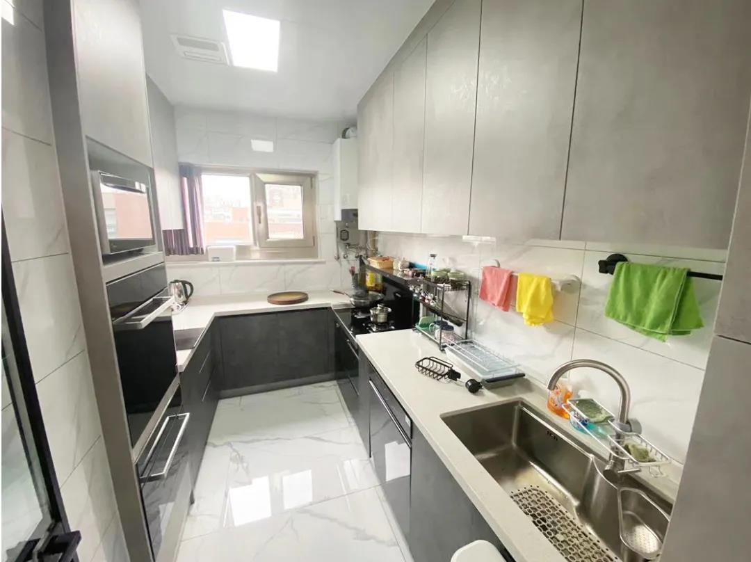 设计师利用定制家具,打造了一组通顶电器柜,消毒柜、洗碗机、烤箱、微波炉,全部整合在这里,其余的空间打造了一组u形橱柜,操作台面加大了,使用起来也更加顺手。