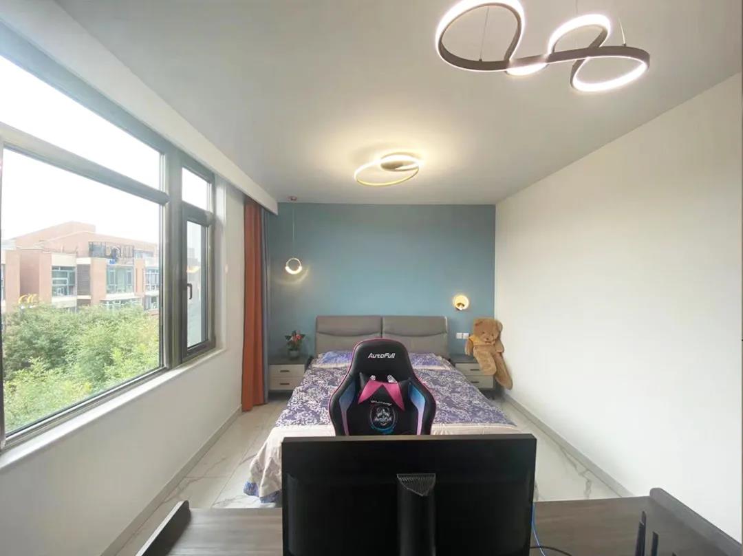 这个空间之前是客厅空间的一部分,设计师规划为了第三间卧室。一整面通顶衣柜增加了卧室储物,借用一部分阳台面积,活动空间更大,采光也充足。