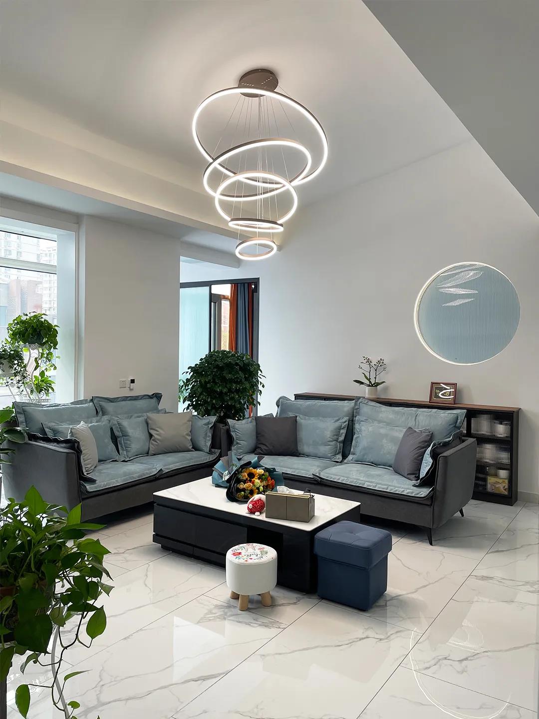 设计师将客厅、餐厅、卧室的轻体隔断墙拆除,对整个空间重新划分,借助采光、造型、以及灯光的运用,让武女士家的这个公共空间,实现了最大化的利用。