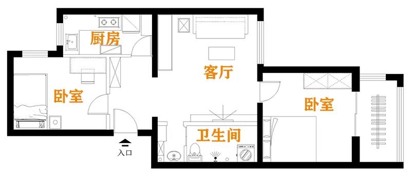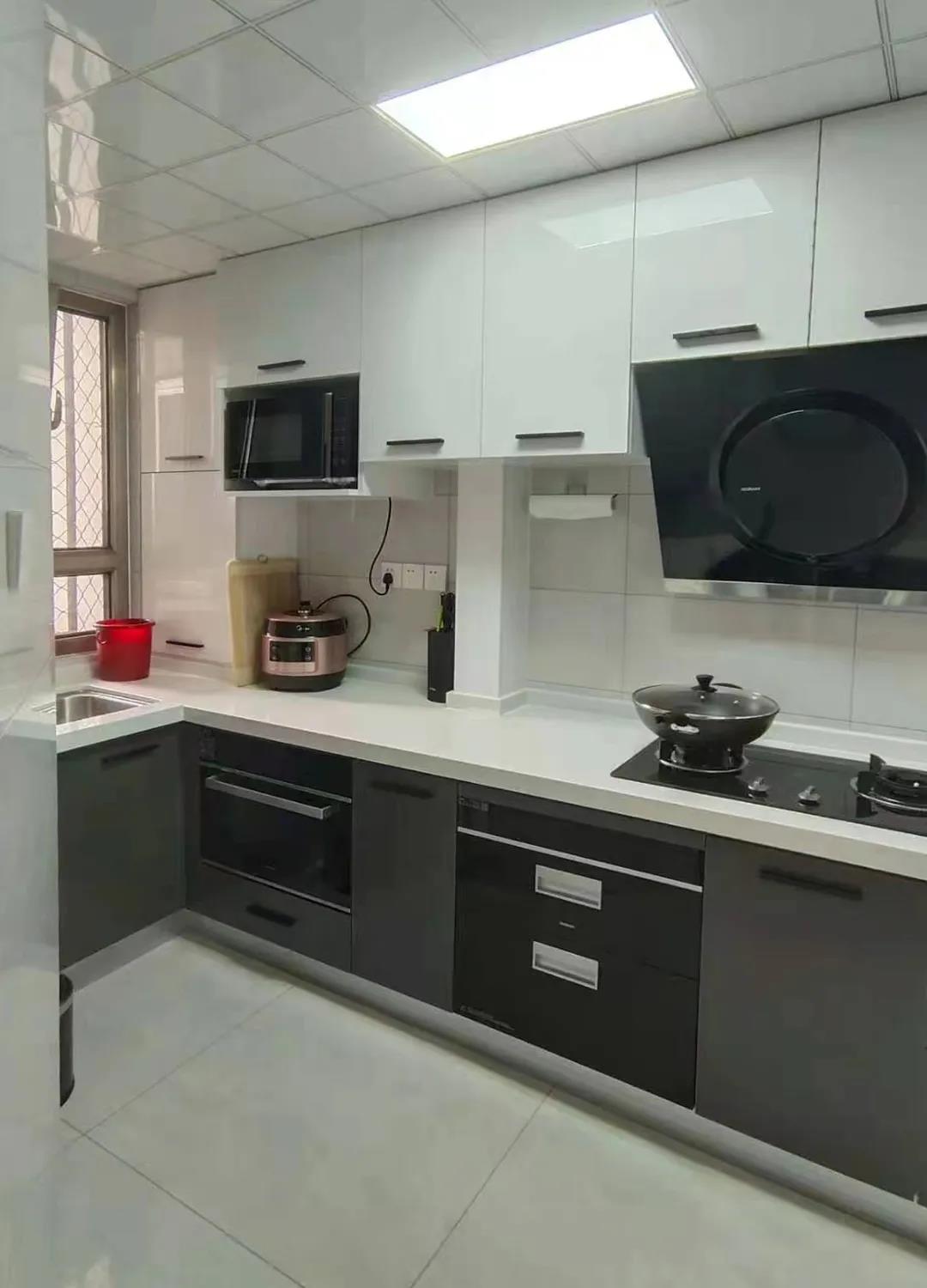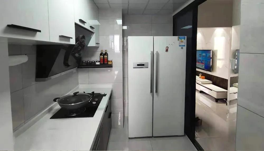 厨房——原厨房T字型墙体改为斜切角,门洞外推,厨房由原来的单门变成双门,面积由4.6平米扩容到了5.3平米。一台双开门冰箱,一组超长台面L型橱柜,动线合理,储物充足,操作空间大大提升。