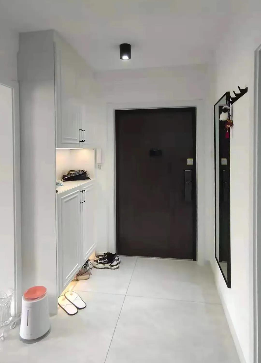 门厅——设计师封堵了原次卧门洞,再将客厅垭口延长了48厘米,在这里打造了一组通顶鞋帽柜,既增加了门厅储物也方便进出随手放置衣物。封堵后的墙体则放置了穿衣镜,顶面利用筒灯进行照明,整体空间明亮实用。