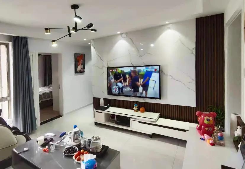 客厅——为了解决客厅视距长,看电视不方便的问题,设计师将客厅格局进行了微调,重新规划了一面墙体,利用大板上墙和木质格栅的搭配打造了一面电视墙,边柜、茶几、沙发依次摆放,双眼皮吊顶配合筒灯照明,整体空间宽敞明亮。