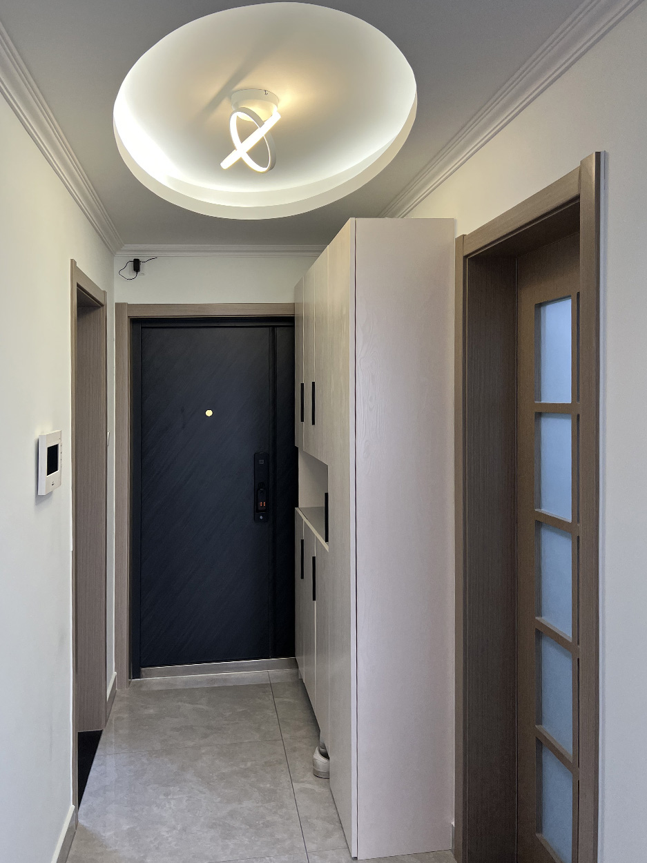 设计师将入户门的开启方向改为了外开,这样进门后左手边的一整面墙都可以利用了,沿墙体打造一组通顶鞋帽柜,解决了门厅的储物问题。顶面的双层吊顶,灯带配合主光源的设计,让门厅空间温馨明亮。