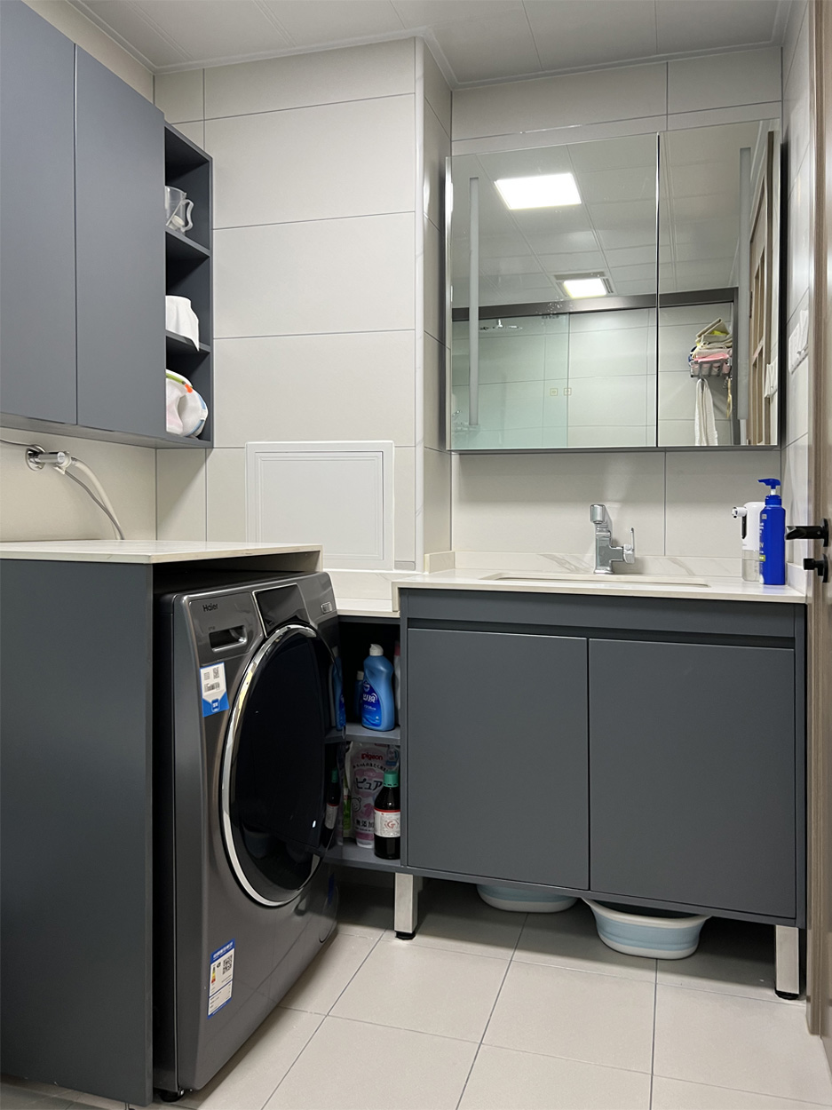 设计师调整了卫生间门的开启方向后,使整个空间都能够更好的利用,进门右手边打造了一组岩板定制的浴室柜,内嵌的洗衣机,节省空间的同时也更易于打理。智能马桶,一字型淋浴房,卫生间规划的更加合理。