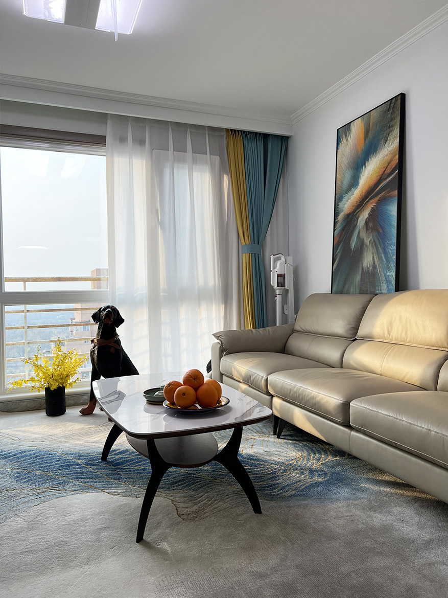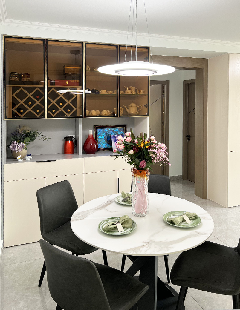 设计师将原来带贵妃榻的转角沙发更换为三人位一字型沙发,给小外孙女留出了更多的活动空间,定制电视柜和定制餐边柜集储物,展示功能于一体,使客餐厅空间更加宽敞,干净明亮。