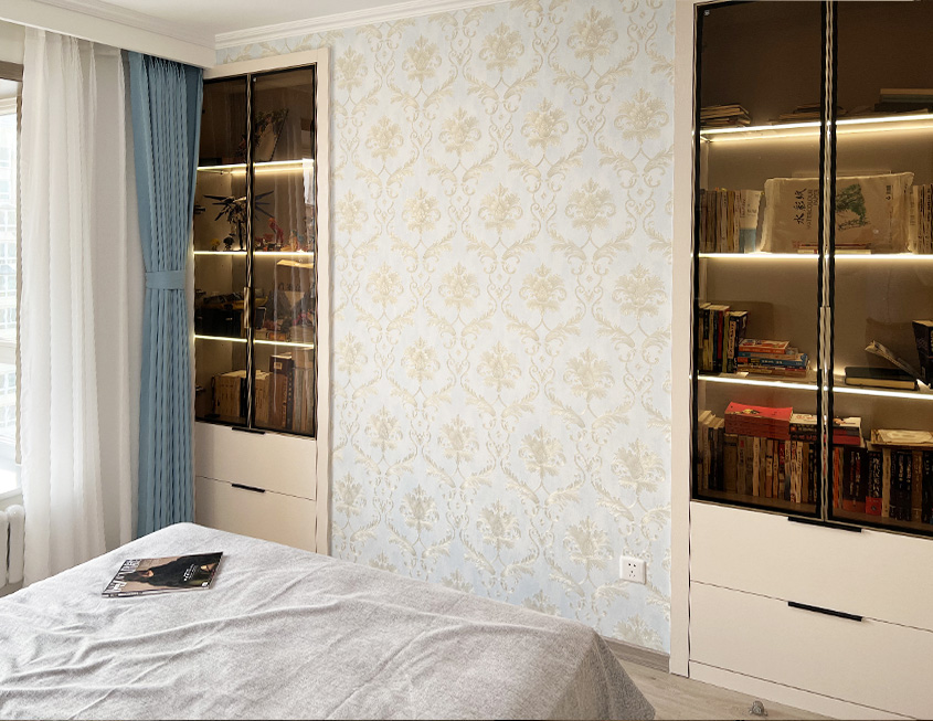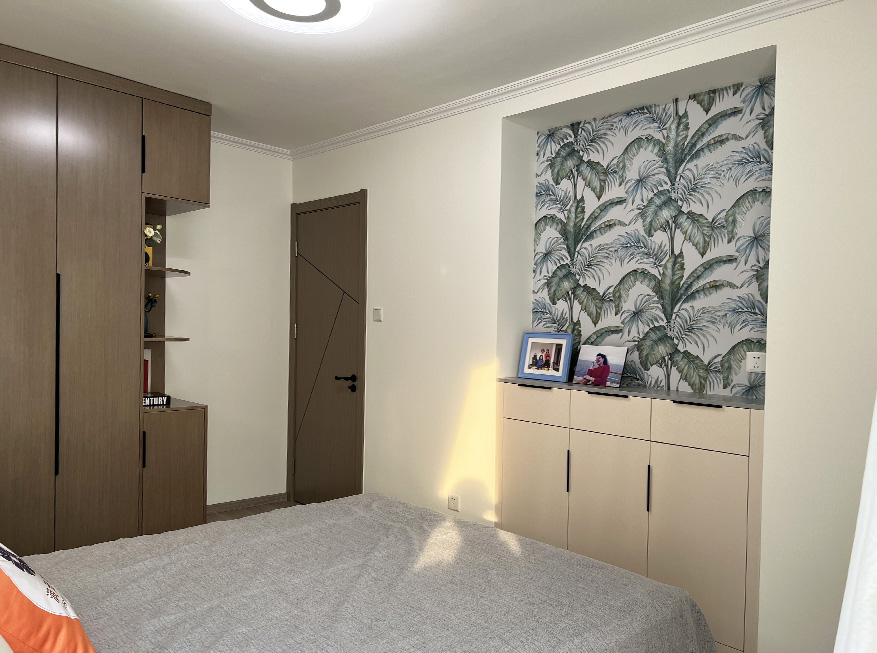 设计师将原来次卧门洞封死,在另一面墙上重新开门,封堵后的这块区域改为了步入式衣帽间,两组内嵌式展示柜,满足了业主的收纳需求。