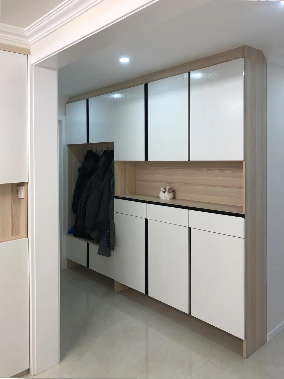 设计师将入户门的开启方向改为外开,让整面墙的定制鞋帽柜使用更方便,白色和原木色的搭配,以及门厅的平面吊顶内嵌筒灯设计,让空间明亮不压抑。