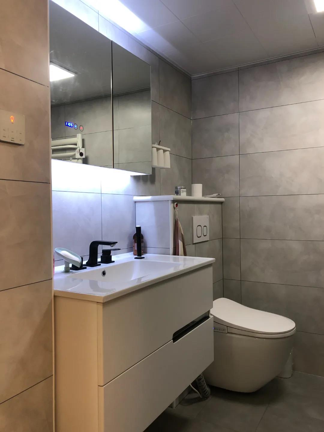 为了解决卫生间门正对入户门的尴尬,设计师将门洞挪到了中间,临近门口的位置规划为了使用频率最高的洗手盆,壁挂马桶和淋浴房,使卫生间更易打理。