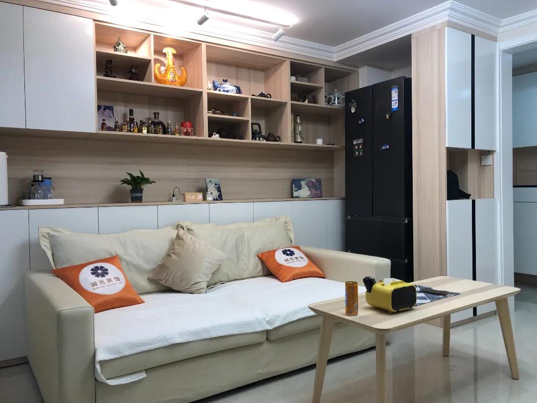 为了解决客厅采光差,空间浪费的问题,设计师拆除了客厅与厨房共用的一面墙体,调转了客厅与厨房的位置,改善了客厅采光。将厨房移走,改为了一个4平米的储物间,并且利用定制家具将沙发背景墙设计为一整面的通顶定制储物柜,双开门冰箱内嵌其中,充分利用了客厅空间。
