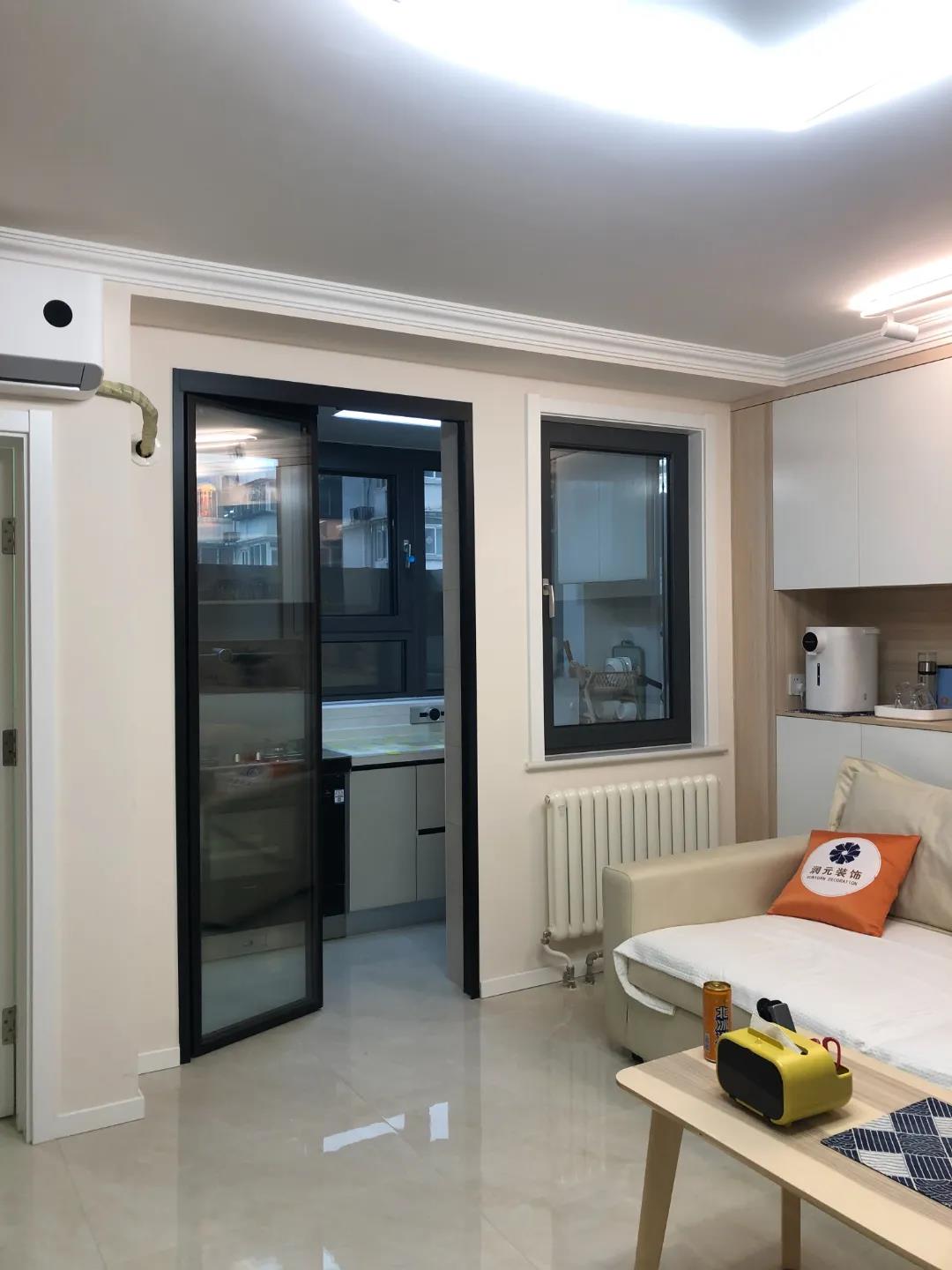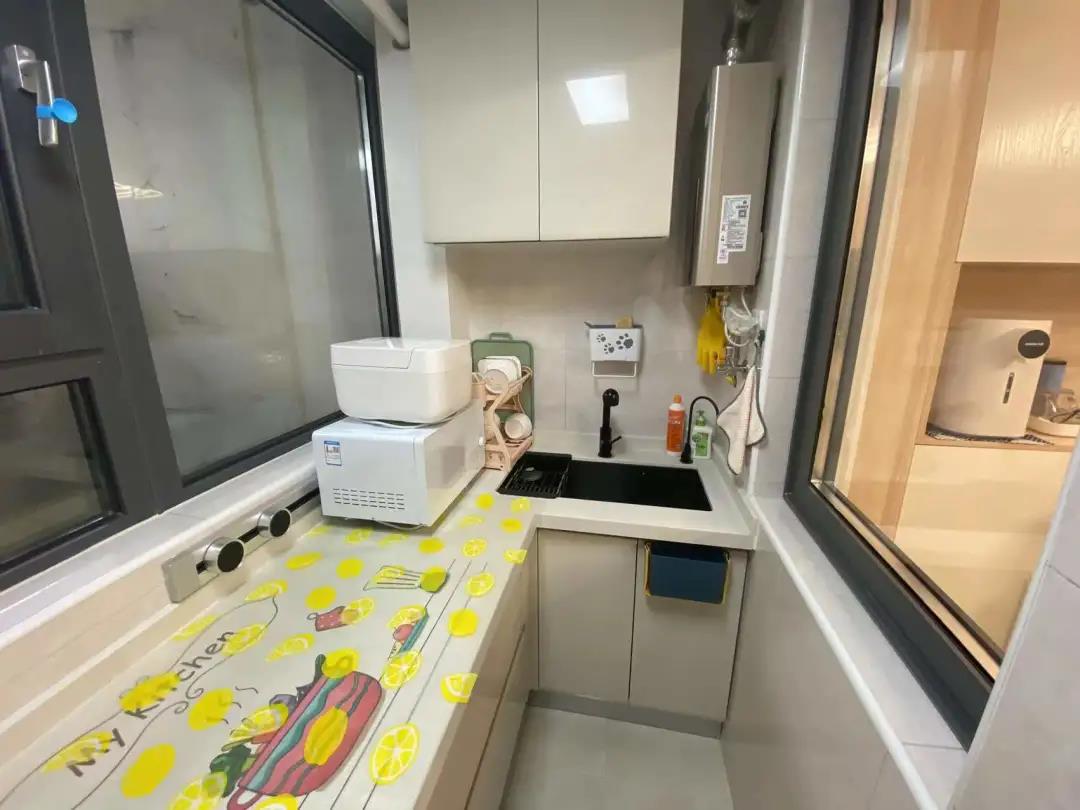 设计师将厨房移到了阳台,同时也解决了阳台空间浪费的问题,考虑到阳台窗户问题,设置了一组L型橱柜,侧面墙体做了吊柜增加储物,选择集成灶,内嵌烤箱功能。阳台的门改为PD门,先推拉后平开,方便大物件进出以及通风。