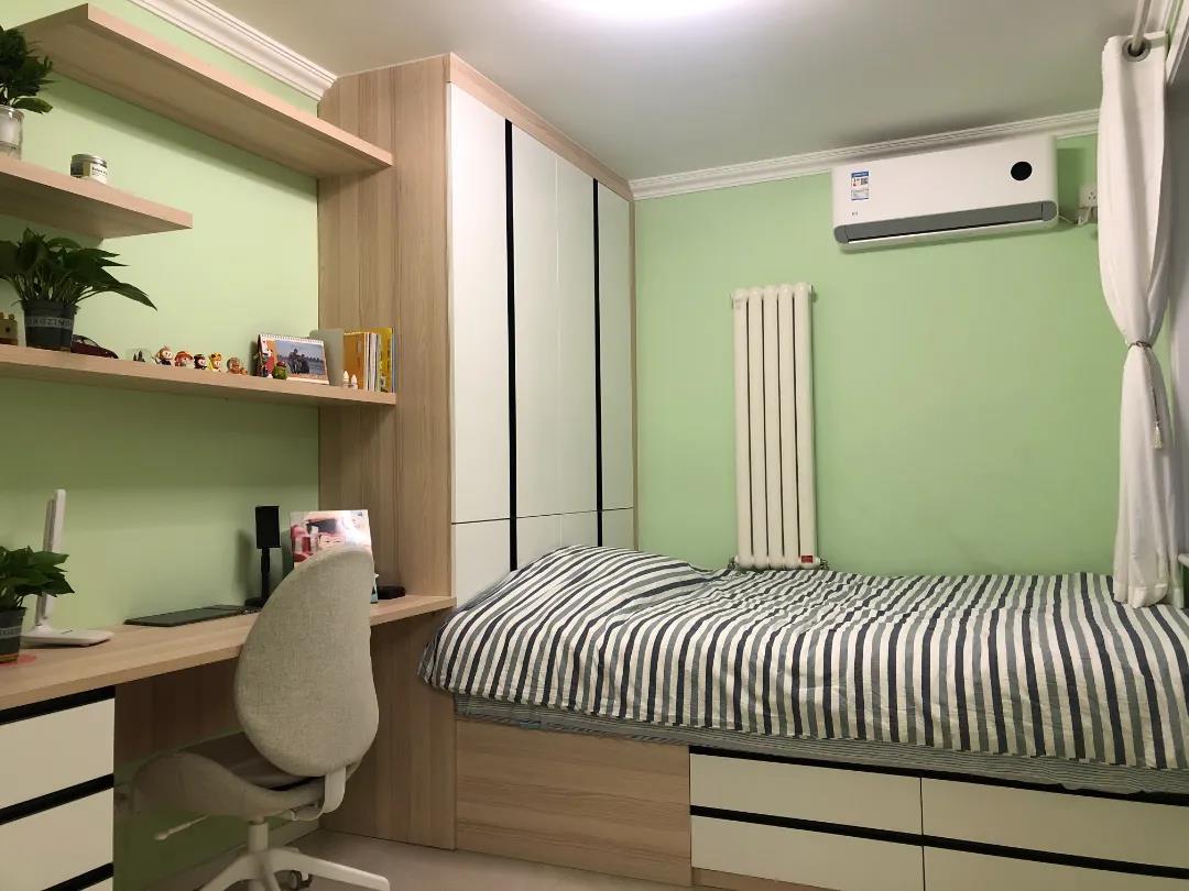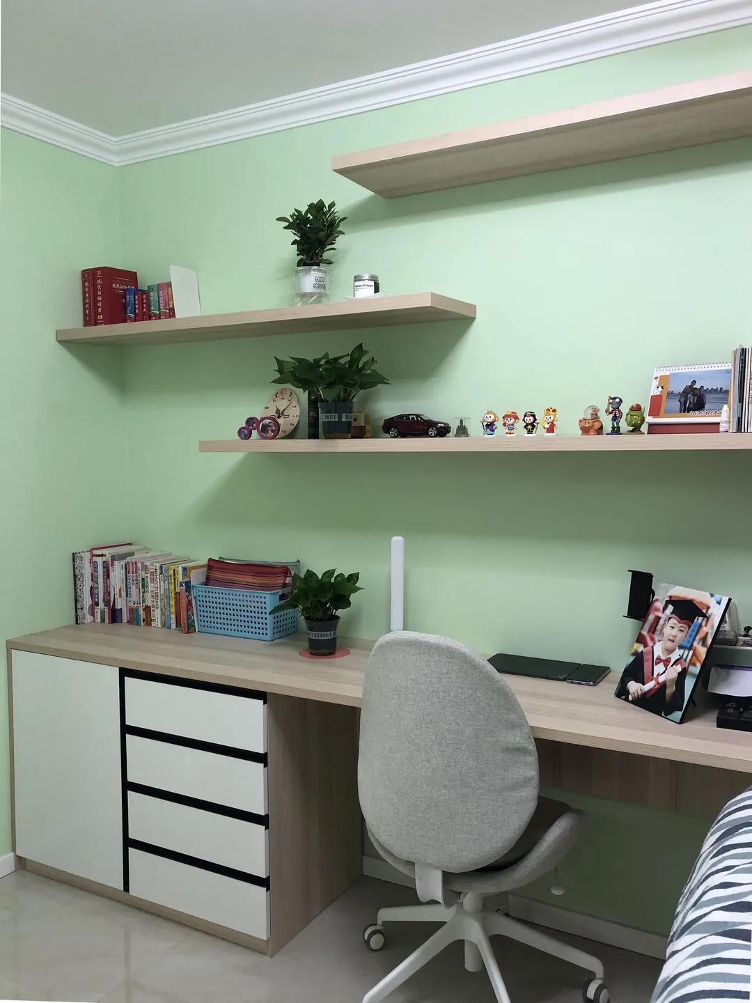 为了让孩子拥有更多的活动空间,设计师将次卧整体做了围合式布局,定制的榻榻米,衣柜及书桌,充分利用空间的同时满足了休息,学习,储物,活动等功能需求。