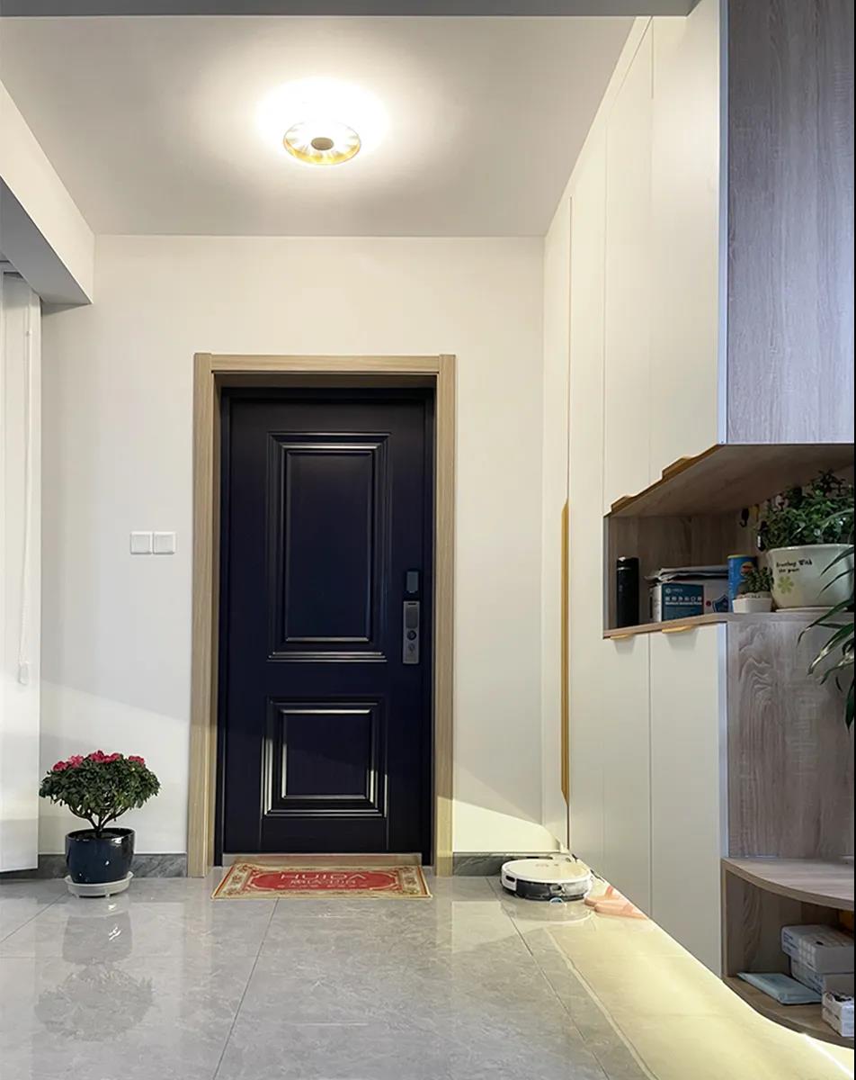 设计师拆除了门厅与客厅共用的这面墙体,使门厅得到了更多的采光,利用AG真人定制家具沿墙体打造了一组通顶鞋帽柜,规划出了挂衣区、放鞋区以及可随手放置小物件的区域,满足了门厅储物需求。