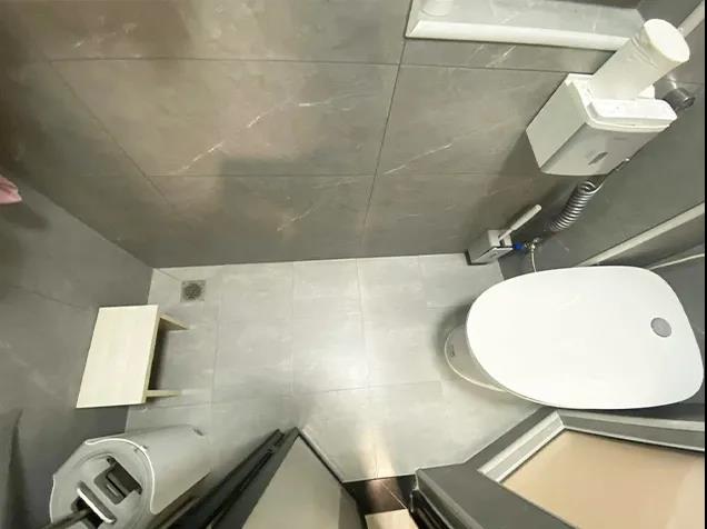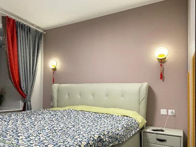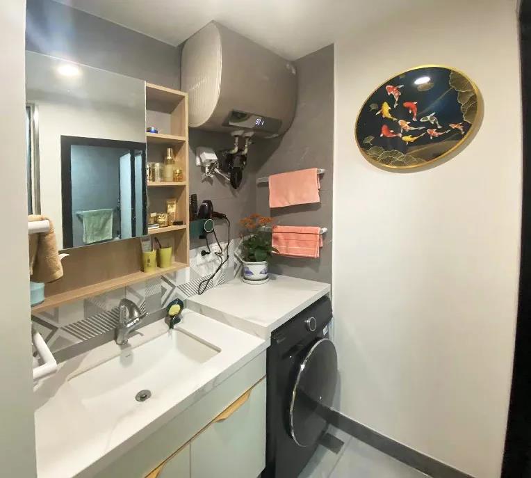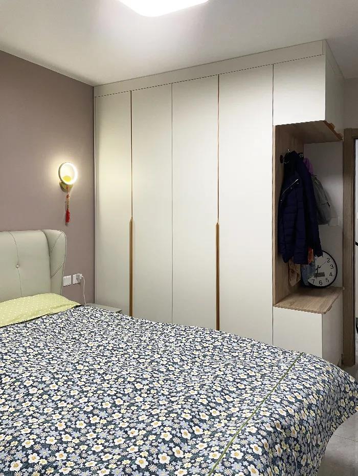 设计师将卫生间和主卧共用的这面轻体墙向卧室挪动了30厘米,在这里打造了卫生间的干区,洗衣机也在这里找到了合适的位置。新建一面异形墙,使马桶和淋浴区使用起来更宽敞舒适。