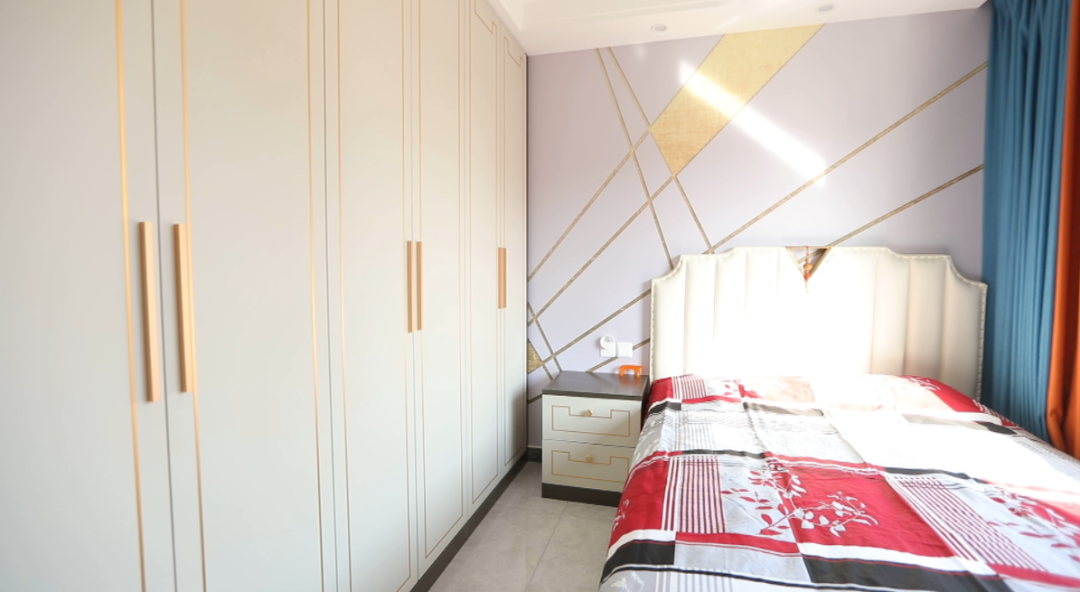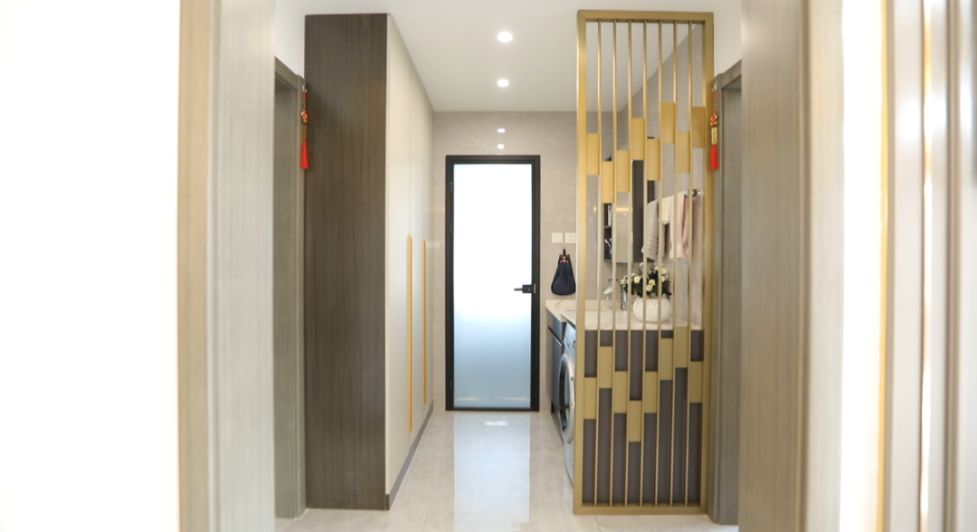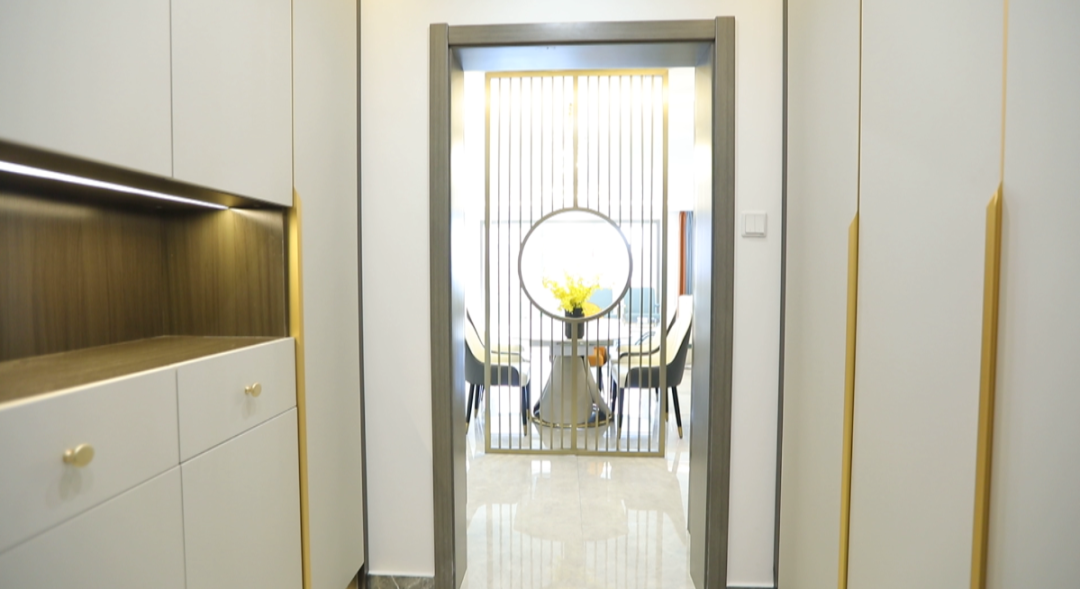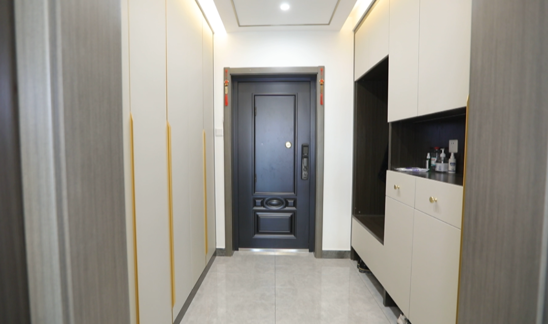 门厅——门厅空间5.5平米,设计师利用定制家具为业主打造了入户玄关,进门左手边一组通顶鞋柜,方便换鞋和简单的挂取衣服、摆放随手物品。右手边则打造了整组的换衣区,利用顶面筒灯、洗墙灯和鞋柜感应灯的配合,让这个采光并不好的入户空间更加明亮。