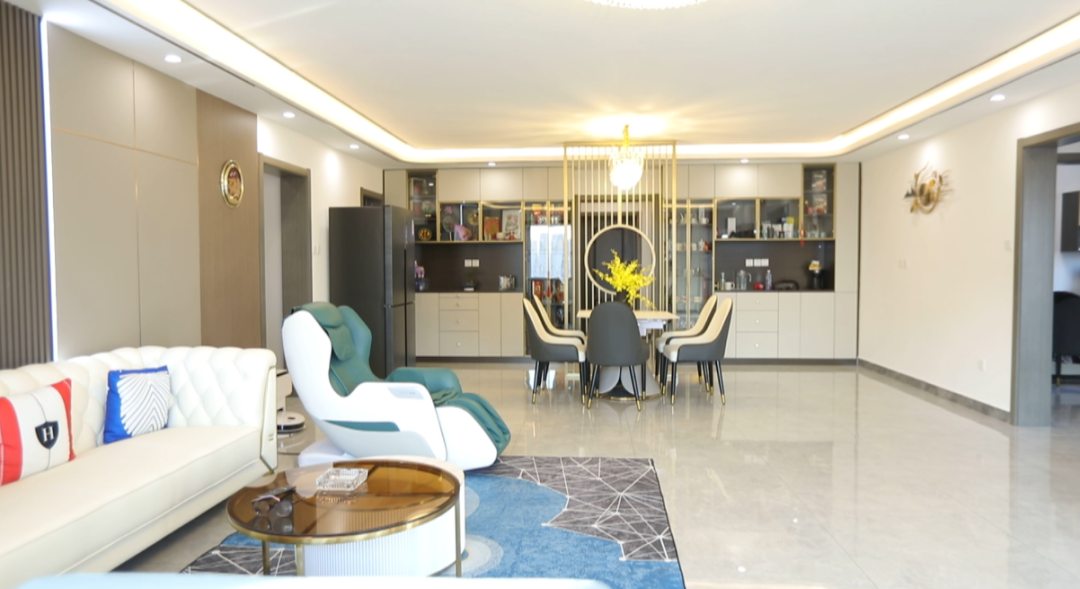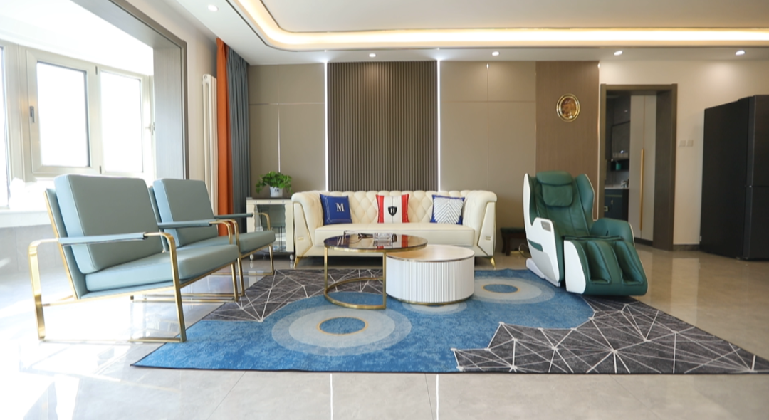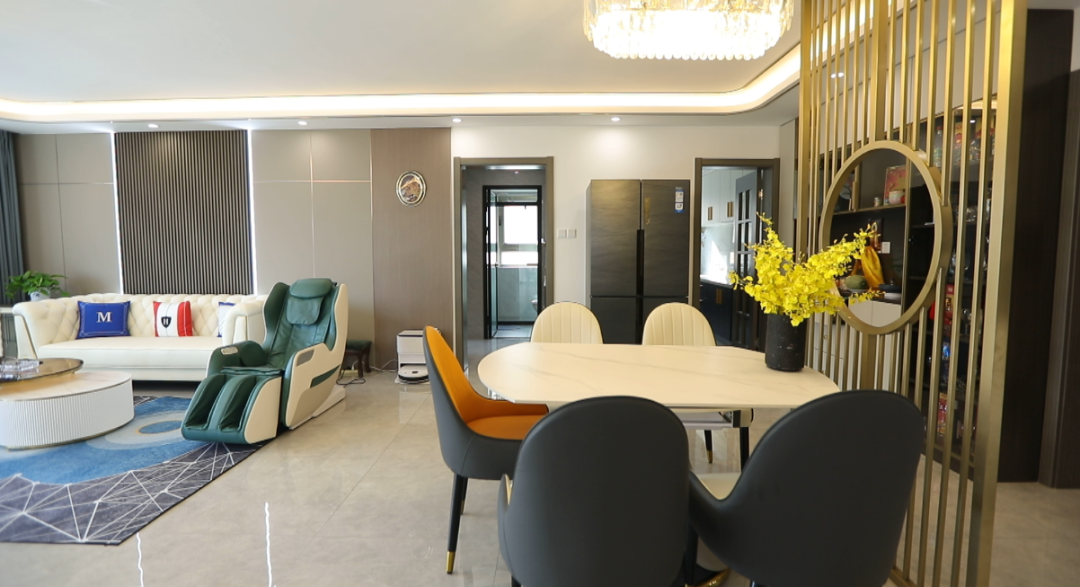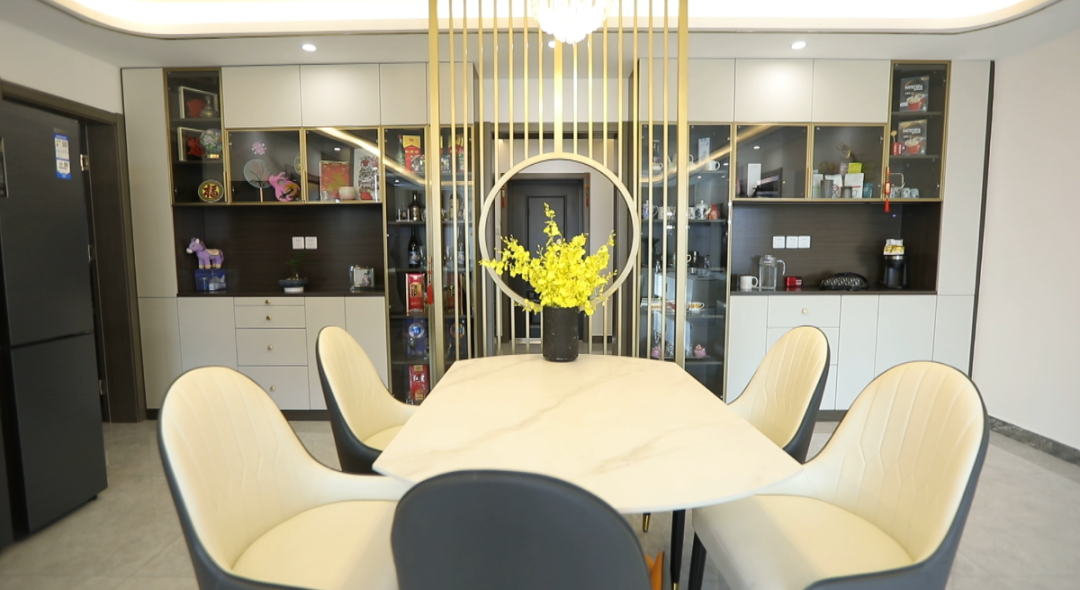 客餐厅——客厅空间47平米,设计师以两个卫生间为中轴线划分出餐厅和客厅空间,利用金属质感屏风为韩女士一家打造出开窗见景效果的餐区,很好的遮挡了餐区及客厅。餐桌居中摆放,两边预留出来的环型动线,走动起来更加舒适。