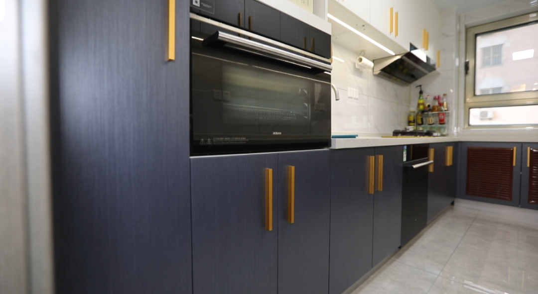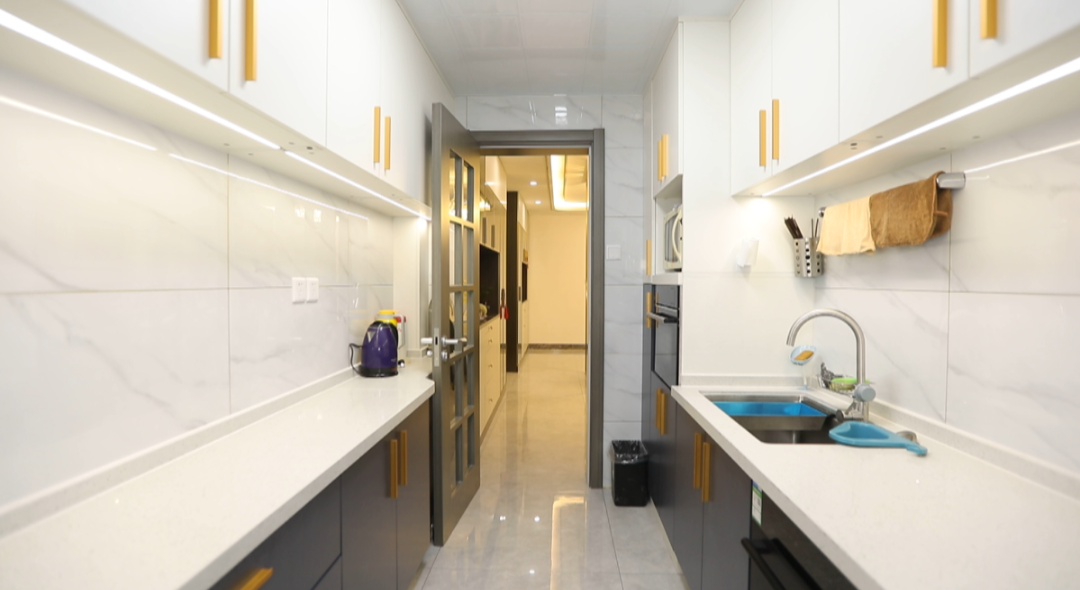 厨房——设计师将这个7平米的厨房重新布局,将冰箱挪到餐区,在这里规划了U字型橱柜,将操作空间和储物空间进行最大化利用,吊柜下方进行了感应灯的设计,照明更充分,通顶电器柜操作更方便。
