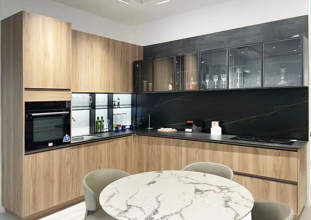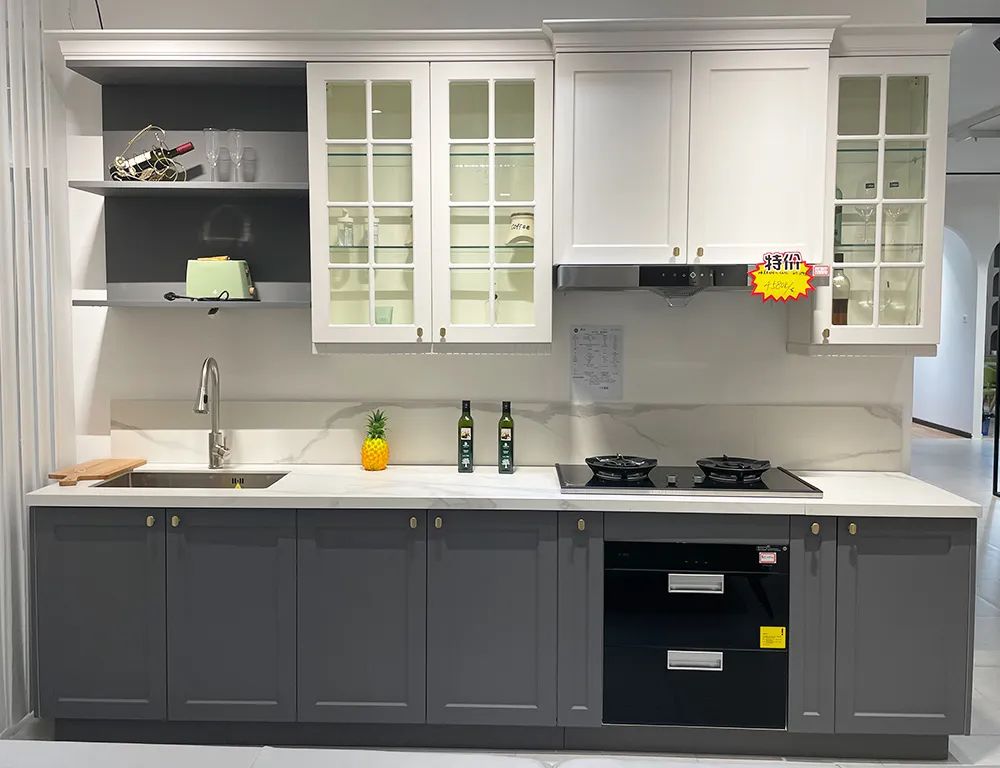 如果您家厨房是狭长型,且没有连接阳台的户型,L形橱柜再合适不过了。这套橱柜,除了展示套餐里配套的柜体、门板、五金外,还为厨房提供了更多的个性化参考。