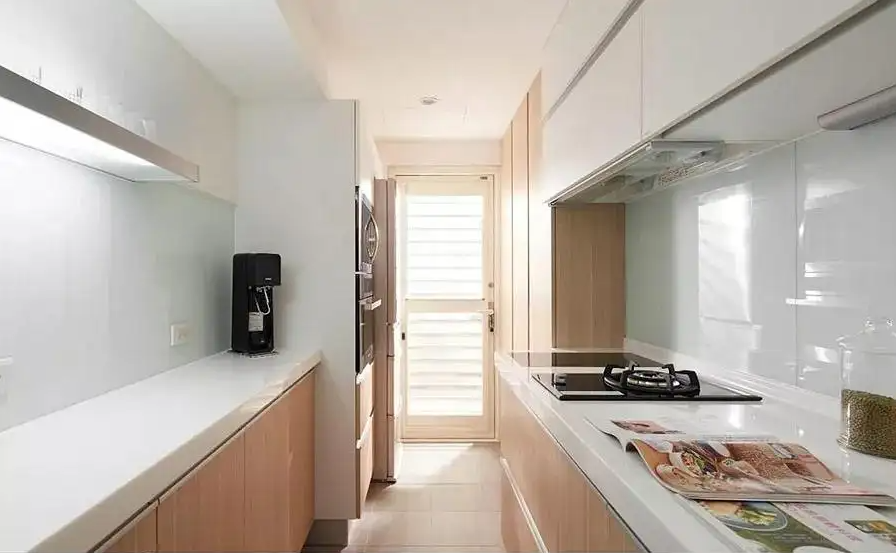 一般面积在4平米左右,宽度在1.5米以下,并且联通阳台的厨房,则建议做一字形橱柜,结合业主的操作习惯和实地情况,来布局洗切炒动线。如果厨房宽度超过1.6米,则可以选择一侧做标准橱柜,而另一侧则可以再做一组薄柜,来增加厨房的收纳。如果厨房宽度不够,则还可以在吊柜上做些文章。