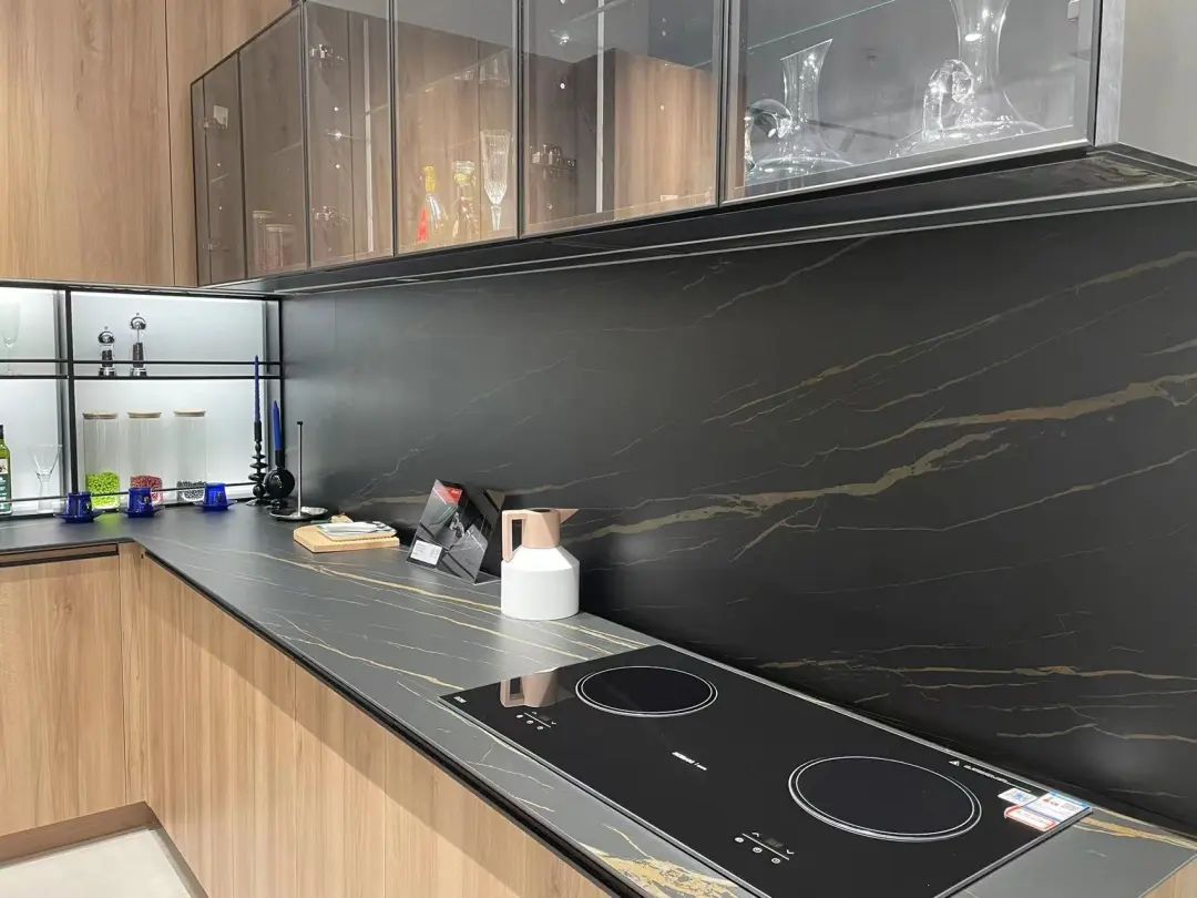 石英石台面升级为了岩板台面,更加结实耐用、抗污能力更强;挡水条升级成了同色岩板上墙,效果整体,而且好打理;增加了定制高柜,扩容了收纳;吊柜的双饰面门板升级成了玻璃门版,看起来更加通透。