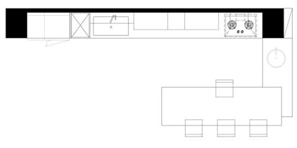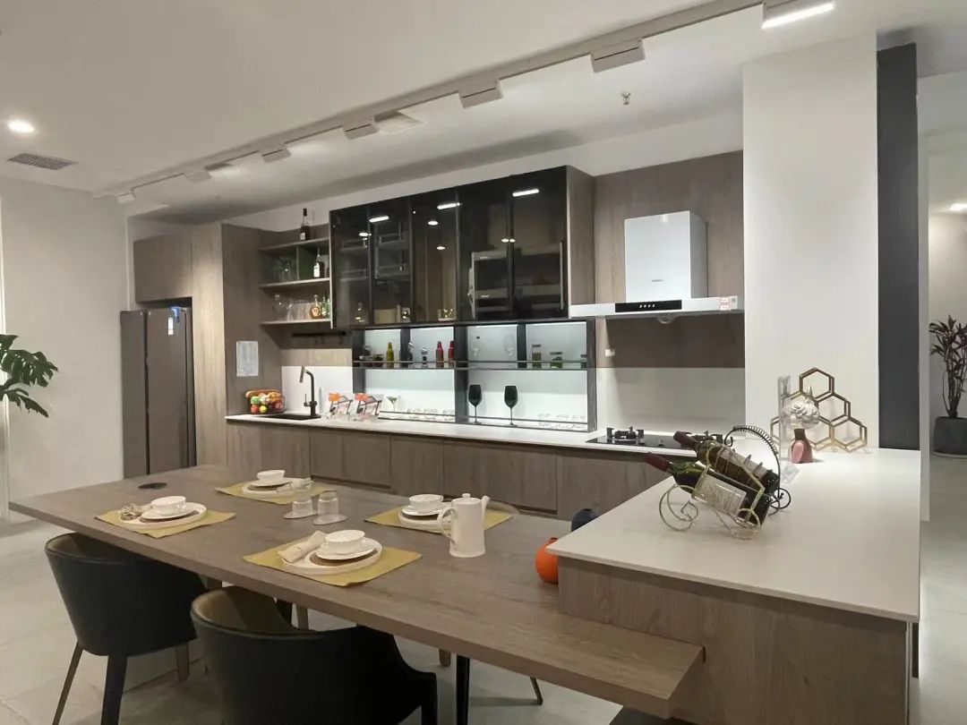 这套橱柜的设计适用于厨房空间10到15平米的家庭,或者能接受餐客厨一体的家庭,可以互借空间,增加互动感和空间感。这里既是厨房、又是餐厅、还可以兼具工作台等多种用途。