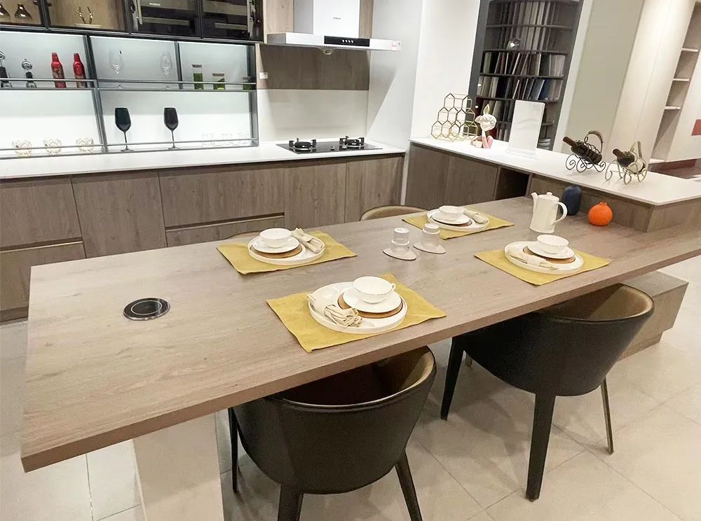 如果空间够大,或者能接受开放式厨房,这套餐岛厨一体的设计理念,您也可以尝试一下。不论是减小柜体厚度、加长柜体,还是这样三段式的吊柜设计方式,分类分区的收纳理念都给橱柜的设计带来了新思路。