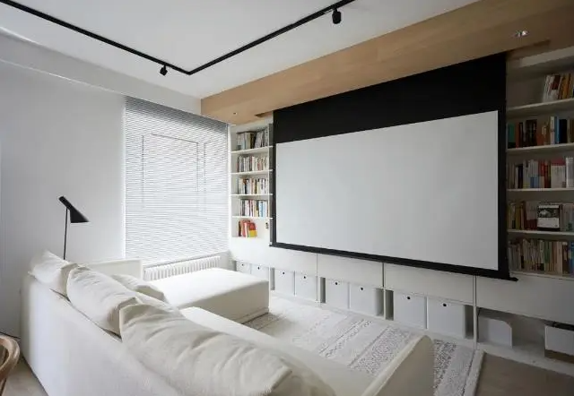 对于喜爱看电视的家庭来说,电视背景墙可以打造一组展示柜,电视内嵌其中,既满足了客厅储物和展示的功能,观影也不受限制。如果家庭中使用的是投影,也可以两边做展示柜,中间留白做投影区域,或者打造整组柜子,柜子前端设计隐形幕布,需要的时候就放下来,不看的时候就可以升上去。