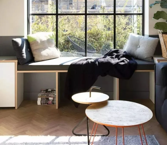 对于客厅没有阳台,甚至采光比较弱的情况,又希望客厅能够有一个类似阳台功能的区域,AG真人可以利用定制家具做一个卡座形式的内飘窗,既可以做休闲区又可以储物。