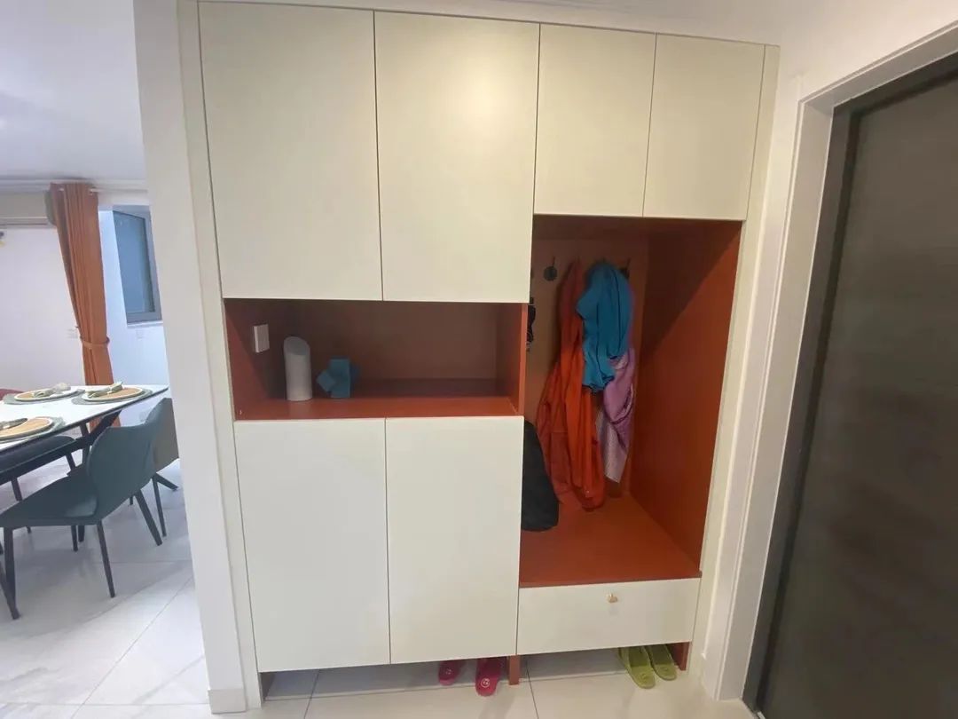 设计师将进门左手边卫生间墙体向门厅方向移动了30厘米,扩大了卫生间面积。同时,将右手边厨房门洞进行封堵,移动这面墙体,压缩部分厨房面积,利用这个凹龛为马女士一家人打造了一组通顶鞋帽柜,解决了门厅的收纳难题。