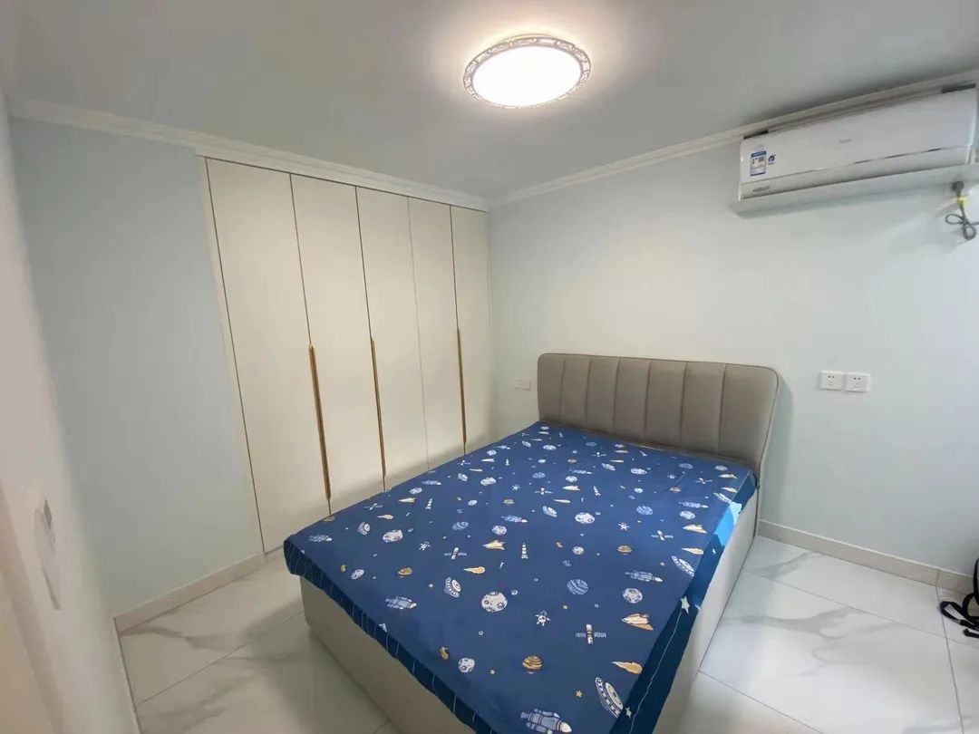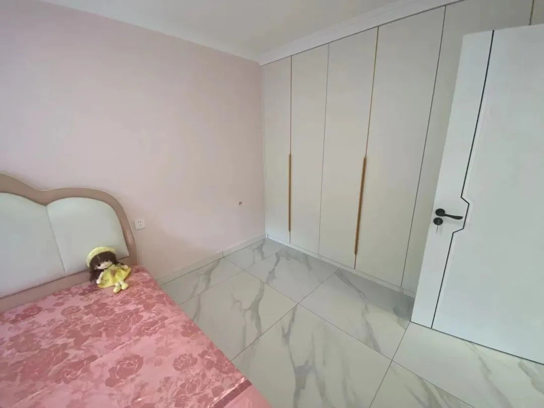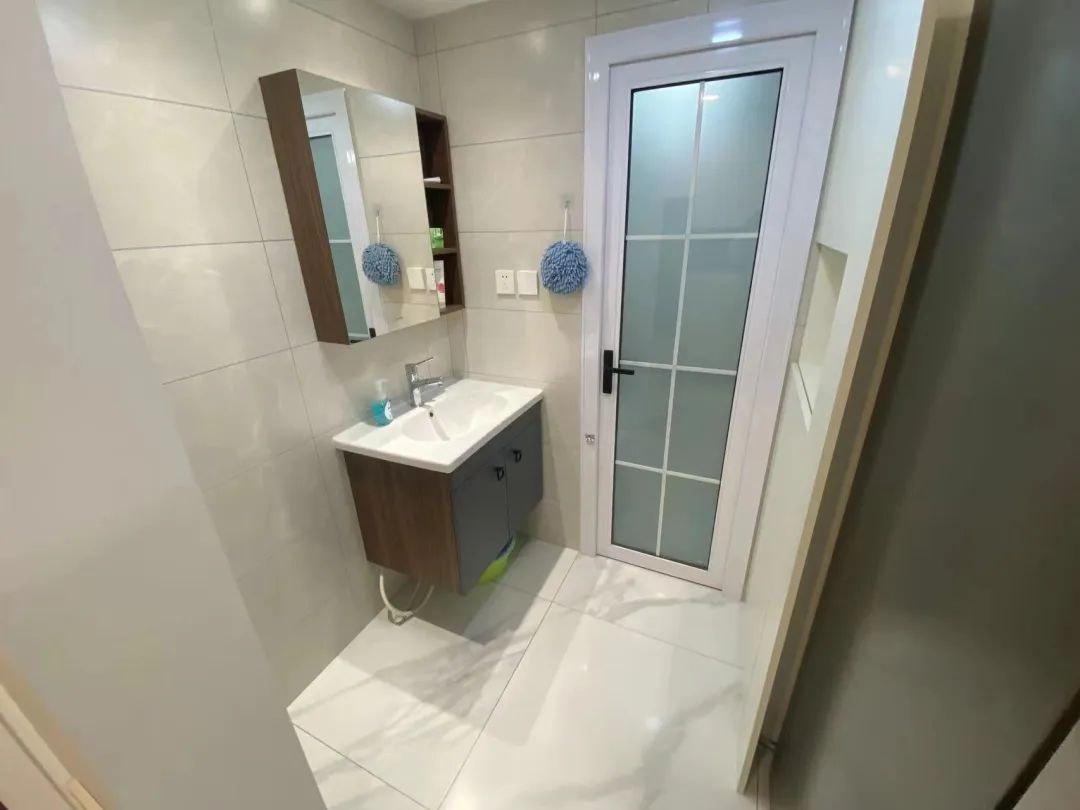设计师挪动了卫生间的墙体后,卫生间的面积扩大到5平米,设计师重新规划出干区和湿区。除了满足如厕、淋浴、洗漱、洗衣功能外,还在这里打造了一组通顶储物柜来分担卫生间的储物难题。