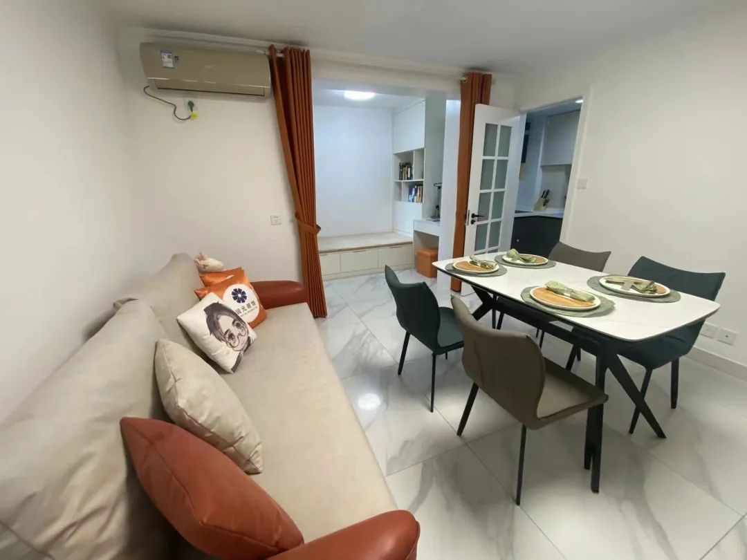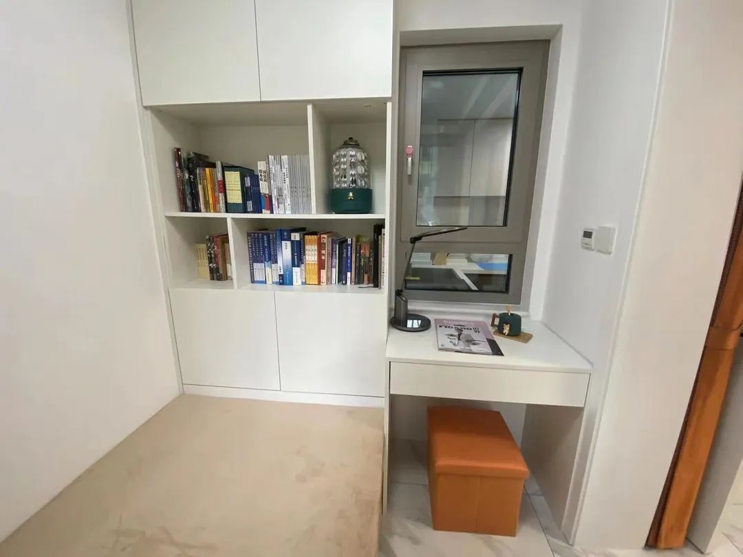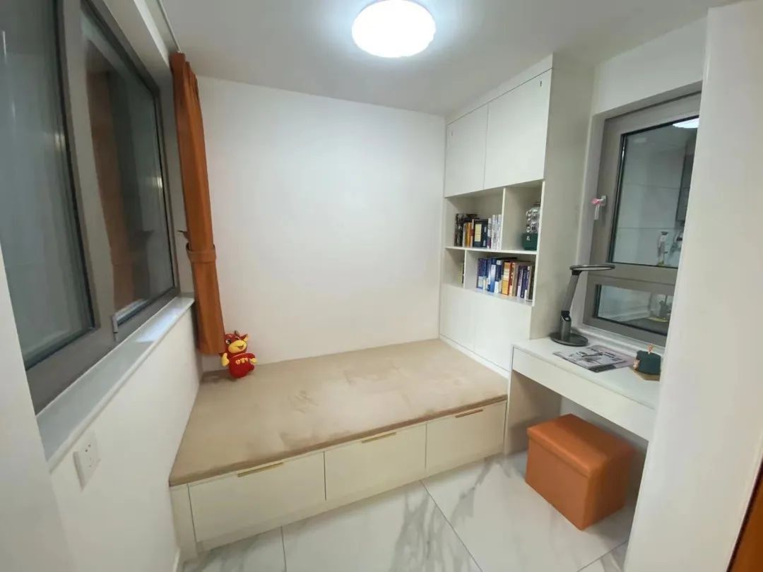 设计师结合马女士家三居变四居的需求,将第四居室安排在原有餐厅的位置,利用AG真人的定制家具打造了集办公、储物、休息为一体的小卧室,为了让客厅与这个空间更加开阔,利用软帘进行分隔。客厅依次摆放了沙发、餐桌方便日后一家人活动、用餐。