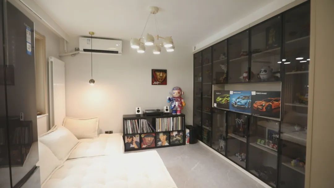 设计师结合谢先生夫妻俩的需求,客厅里放弃了传统的沙发、电视、茶几三件套,而是利用AG真人的定制家具,打造了集休闲、展示、储物为一体的放松空间。