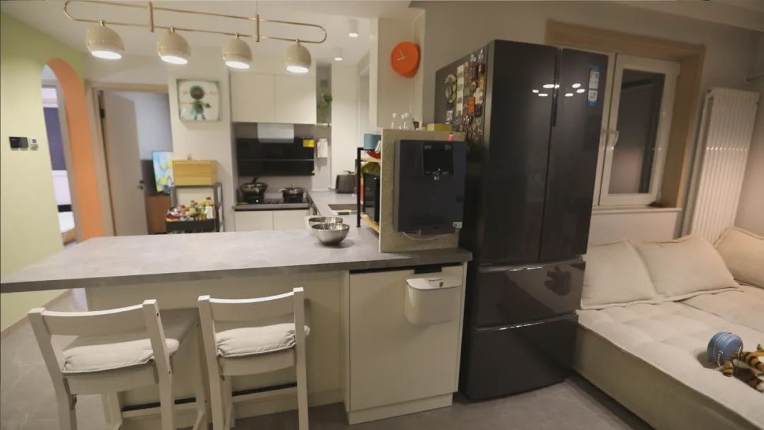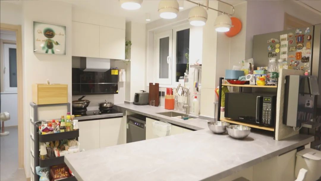 设计师拆除了厨房的部分墙体,做成开放式厨房,结合业主身高打造的不同高度的一组L型橱柜,也方便后期使用,岛台的设计,更是便于一家人的互动沟通。厨房上的梁也被设计师巧妙隐藏进吊顶里,整个顶面更为整体美观。