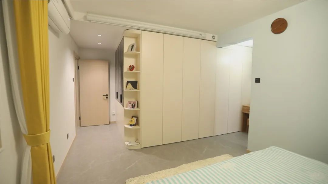 设计师把另外一套房的客餐厅空间,规划成了谢先生夫妻的主卧,加上内嵌一个卫生间,形成一个套间,整体空间舒适,原本入户门的位置,放置了梳妆台,靠近卫生间洗漱化妆非常方便,同时,在原本餐厅的位置,利用AG真人的定制家具做了一个隐形步入式衣帽间。