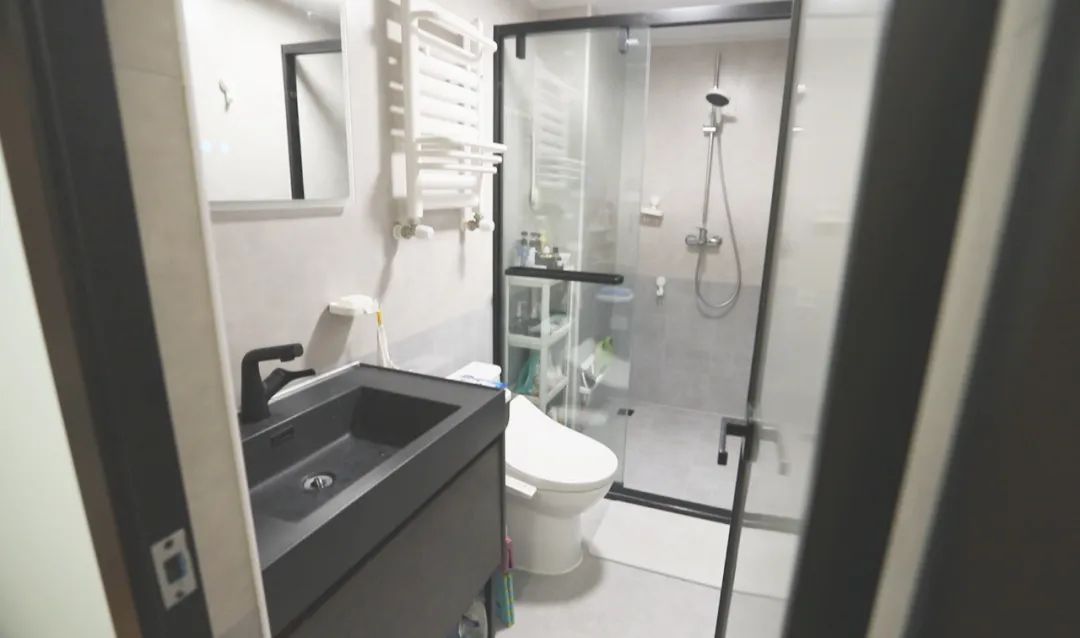 设计师根据使用的频率和动线,对2个卫生间进行了整体分区,靠近客厅的这个卫生间作为公共卫生间,供一家人使用,主卧房间里的卫生间则单独提供给夫妻俩来使用。2个卫生间都是合理规划出了干区和湿区,如厕、淋浴、洗漱功能齐全。