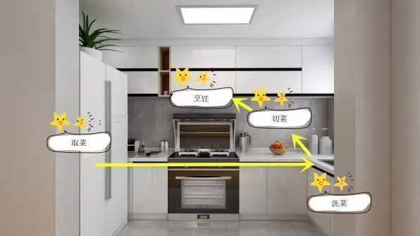厨房最重要的是动线设计,如果整体动线设计不合理,不但让使用者操作不方便,而且还会让原本狭小的空间更加局促。所以,动线设计要根据业主的烹饪习惯和生活习惯,结合厨房的格局,合理进行功能区的划分,决定冰箱、水池、备餐台、燃气灶、装盘台等位置,减少不必要的走动。