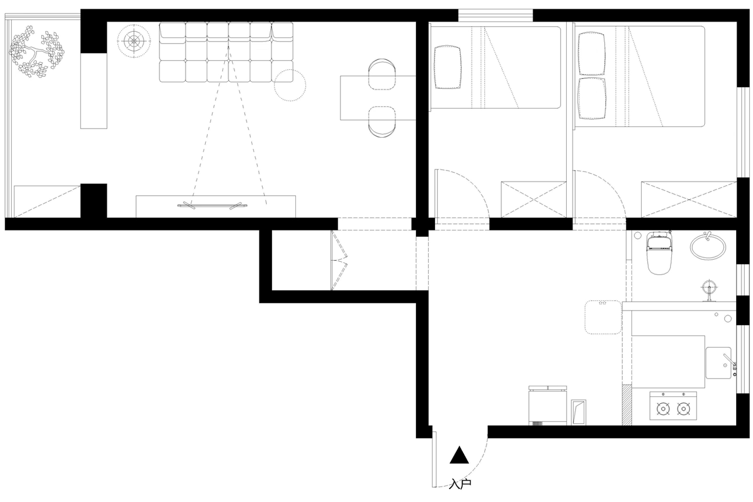 客厅打破传统的电视、沙发的正对布局,采用去中心化的布局方式,满足客厅的休闲、会客、办公、储物等多种功能。