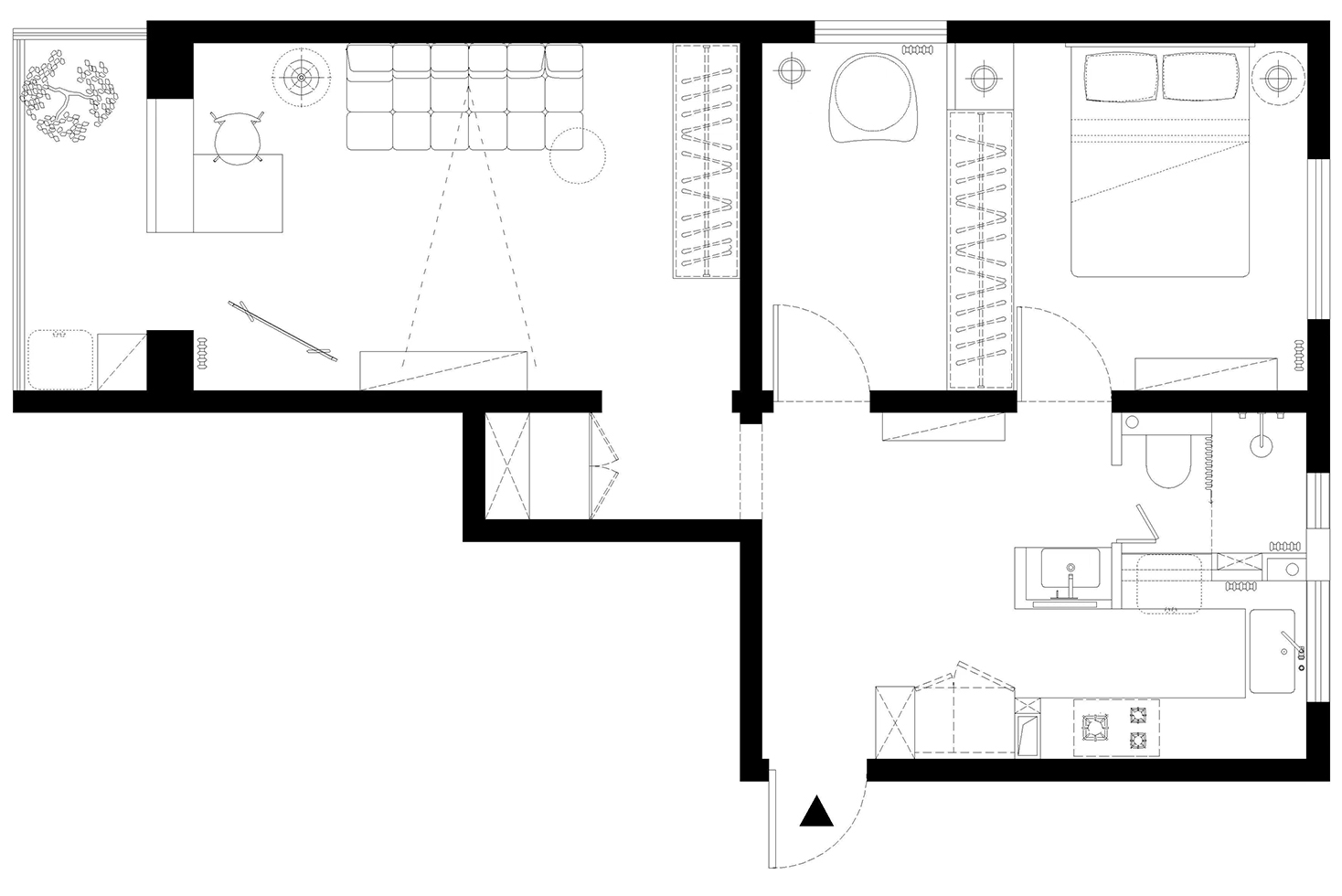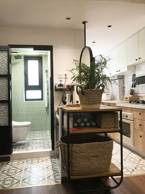 卫生间由原来1.9平米,扩大到现在的2.2平米,扩充出来的这部分空间,作为卫生间的洗漱空间,让卫生间实现了干湿分离。S墙的设计,让卫生间和厨房空间,无论从平面还是立面上利用的都更加充分。壁挂马桶,还解决了卫生间高台的问题。