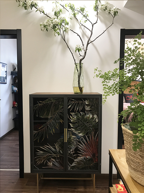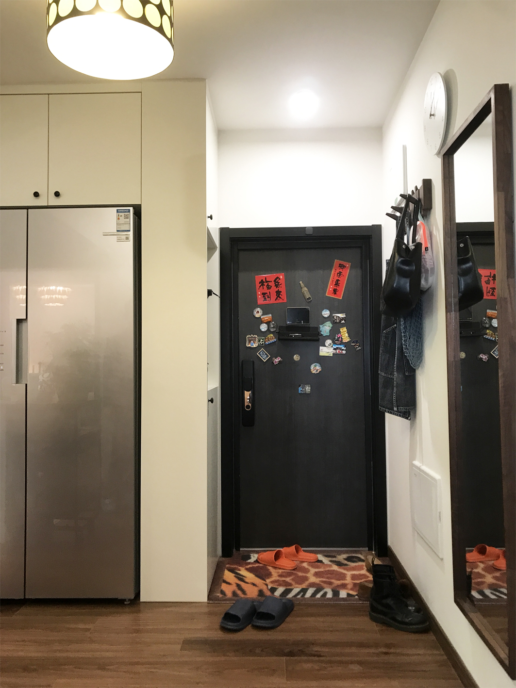 门厅面积9平米,设计师将部分门厅空间分配给了厨房和卫生间,入户空间一组通顶的储物柜来满足进门储物。