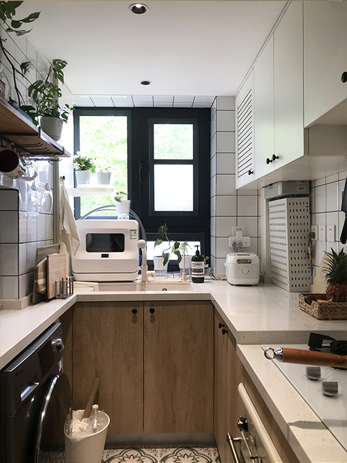 厨房改为开放式,延伸至门厅,空间由原来的3平米扩到到现在的将近6平米。U形的厨房布局,洗切炒动线合理,操作空间宽敞。通过尺寸的精准排布,洗衣机、厨房小家电也都找到了合适的位置。