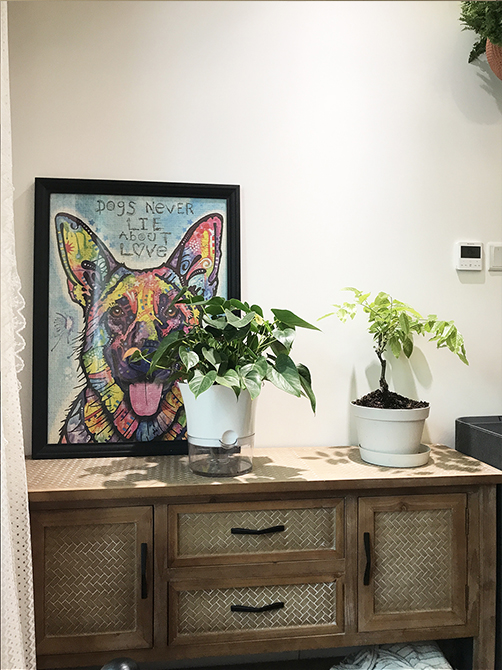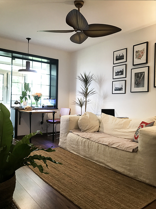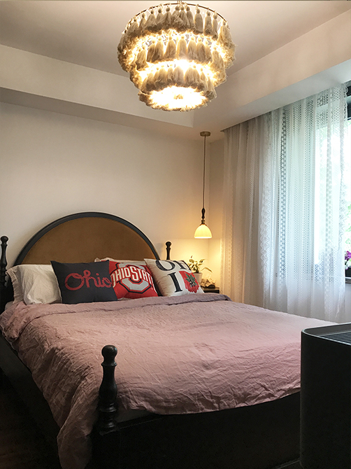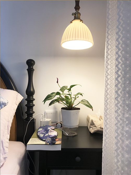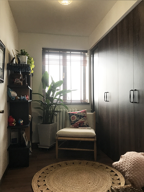 朝北的这间作为主卧室,但是因为只有8平米,所以借用了一部分次卧的空间,同时用定制家具作为这两间卧室的隔断,分隔主卧室与书房,节省了空间。使用风管机代替挂式空调,用吊顶把管道、风管机设备都藏起来。风格上,亚麻、胡桃、绿植等材质运用,来营造南洋复古风。