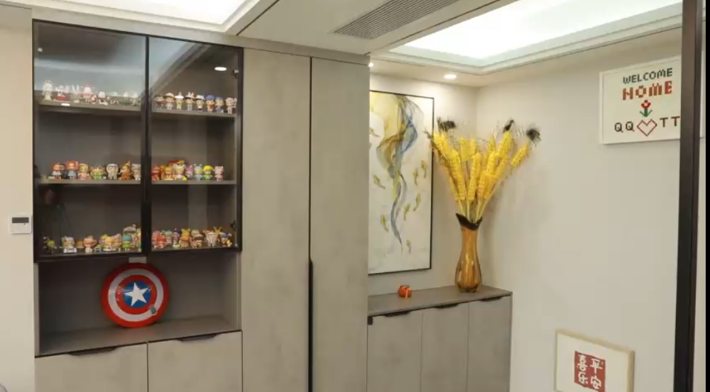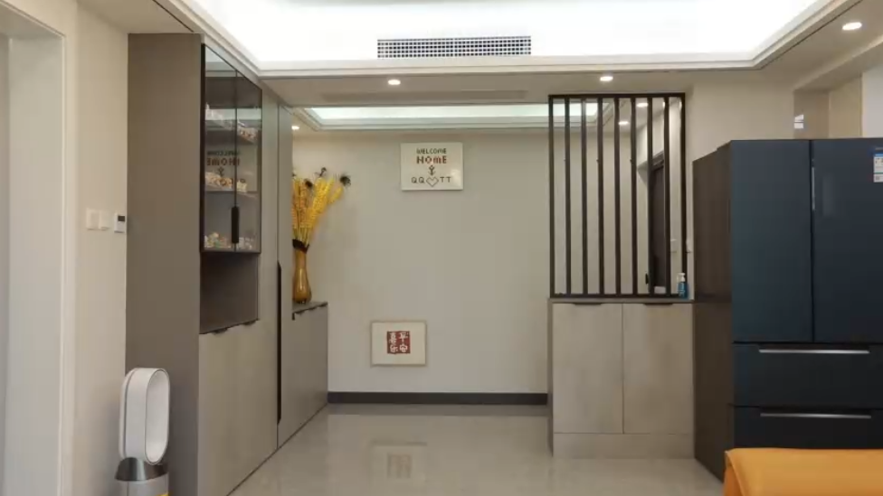 设计师在入户门的左手边为业主规划了一组玄关鞋柜,上半部分金属镂空设计,既可以提供门厅所需的储物,又可以使客厅空间更具有私密性。正对入户门空间做了玄关端景,结合回字形吊顶,让业主拥有了一个既实用又美观的玄关空间。