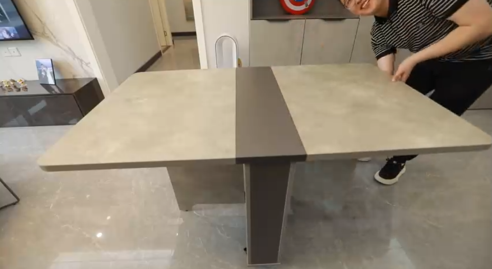 设计师沿玄关端景延伸过来,一组储物柜一组餐厅展示柜,自然地过度到了用餐区,通顶的定制柜既提供了储物空间,同时也可将折叠餐桌存放其中,用餐时餐桌展开可达1.4米x0.8米,可满足8到10人同时就餐,不用的时候可折叠存放在餐边柜,使空间利用起来更加灵活。