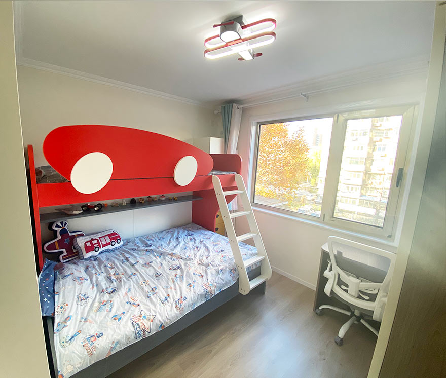 设计师将这间次卧改成了儿童房,高低床的设计方便老人照顾孩子,利用定制家具打造了一组集学习,储物,展示为一体的学习区域。